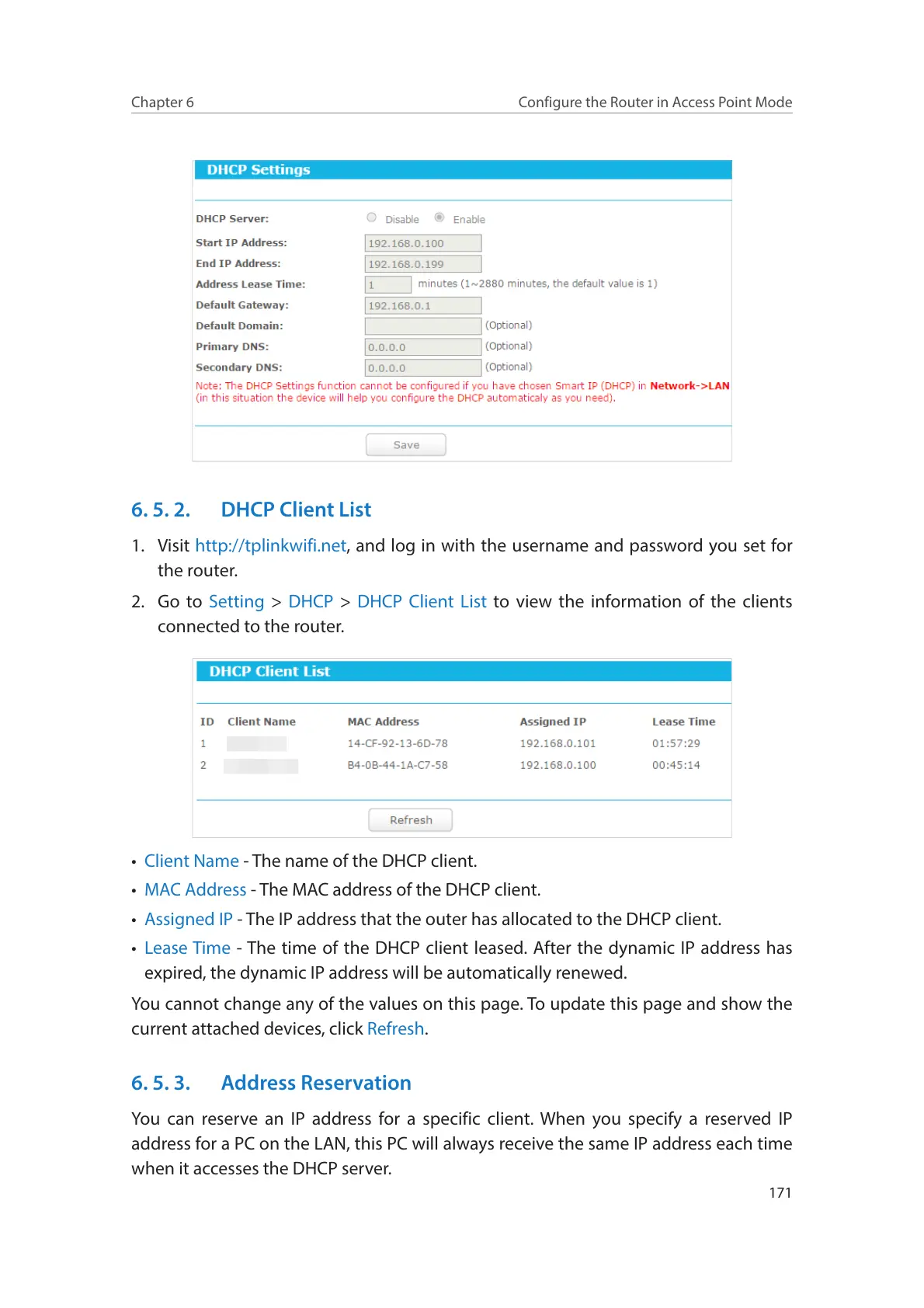 • Lease Time - The time of the DHCP client leased. After the dynamic IP address has