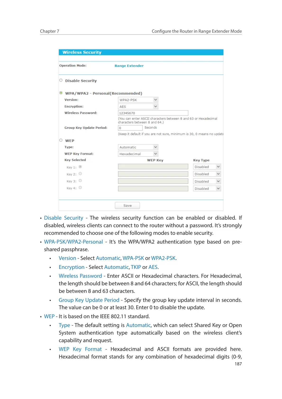 • WEP Key Format - Hexadecimal and ASCII formats are provided here.