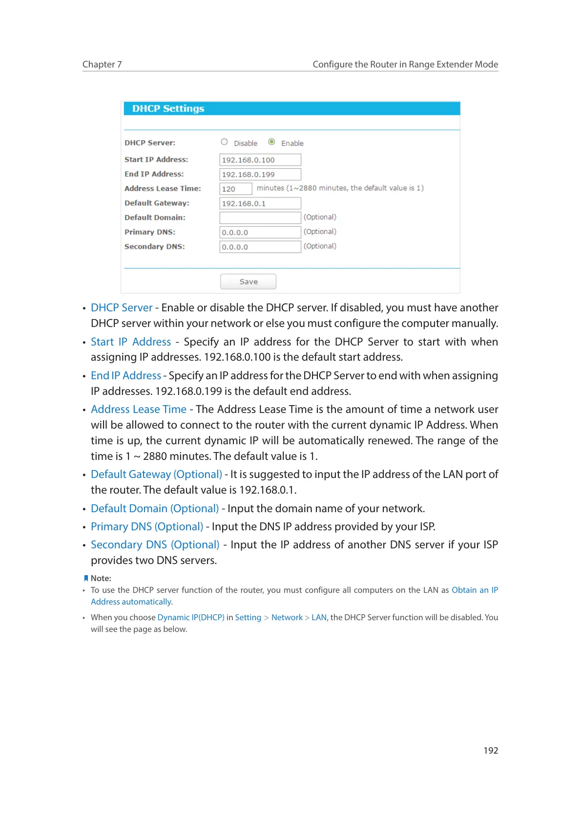 • DHCP Server - Enable or disable the DHCP server. If disabled, you must have another