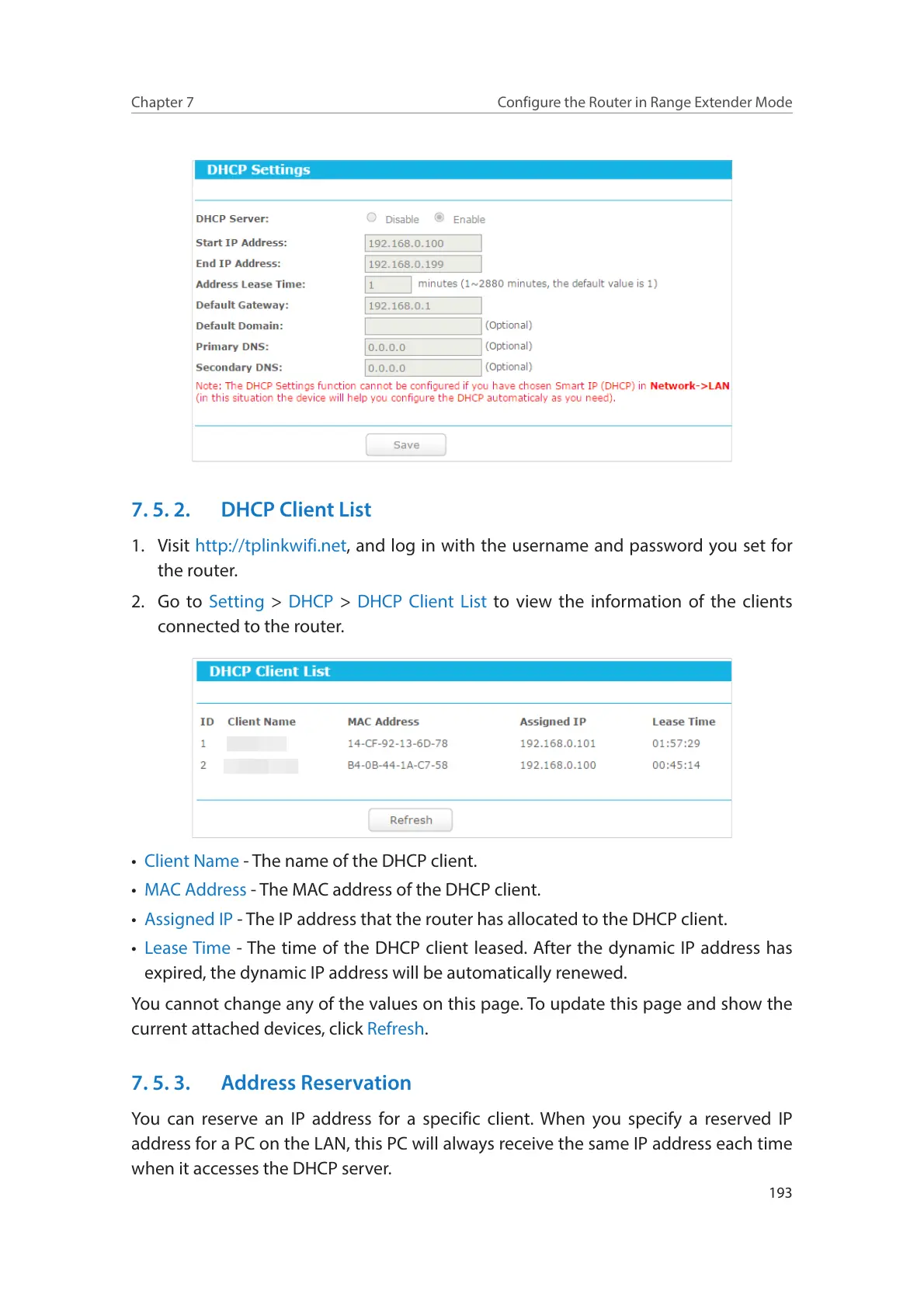 You can reserve an IP address for a specific client. When you specify a reserved IP
