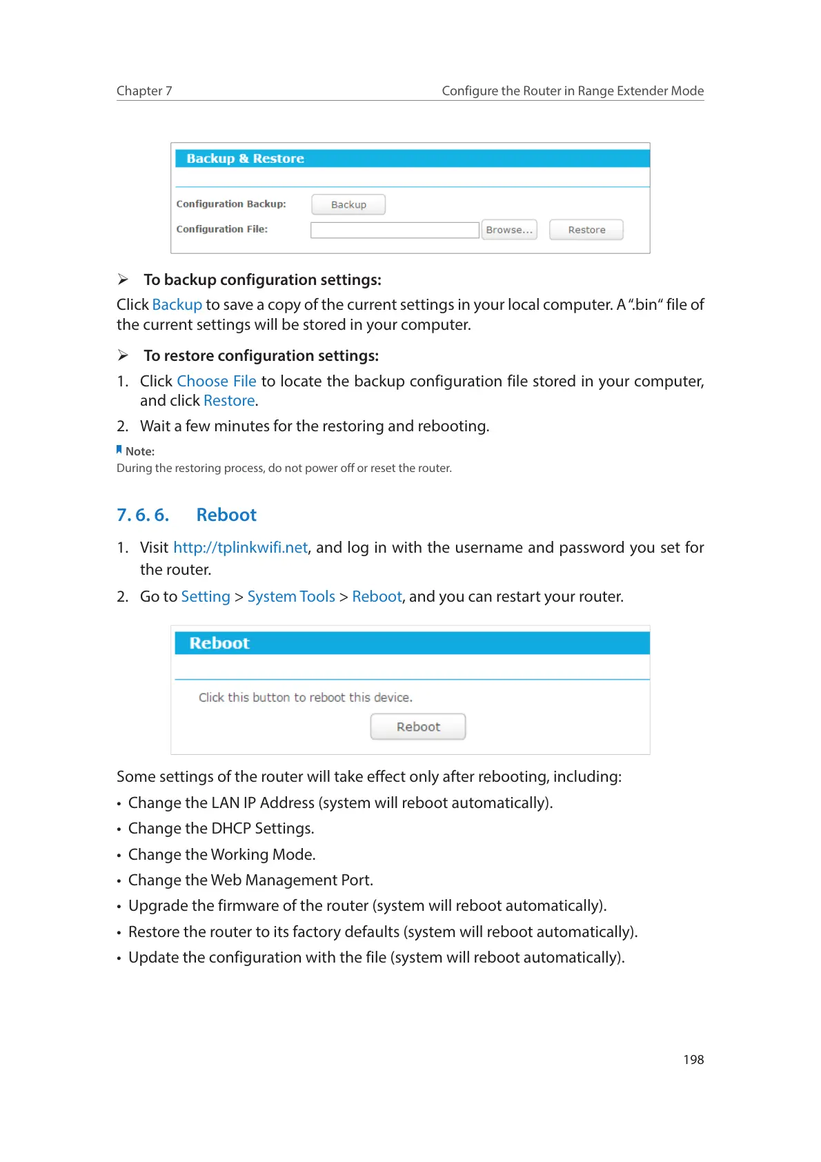 Some settings of the router will take effect only after rebooting, including: