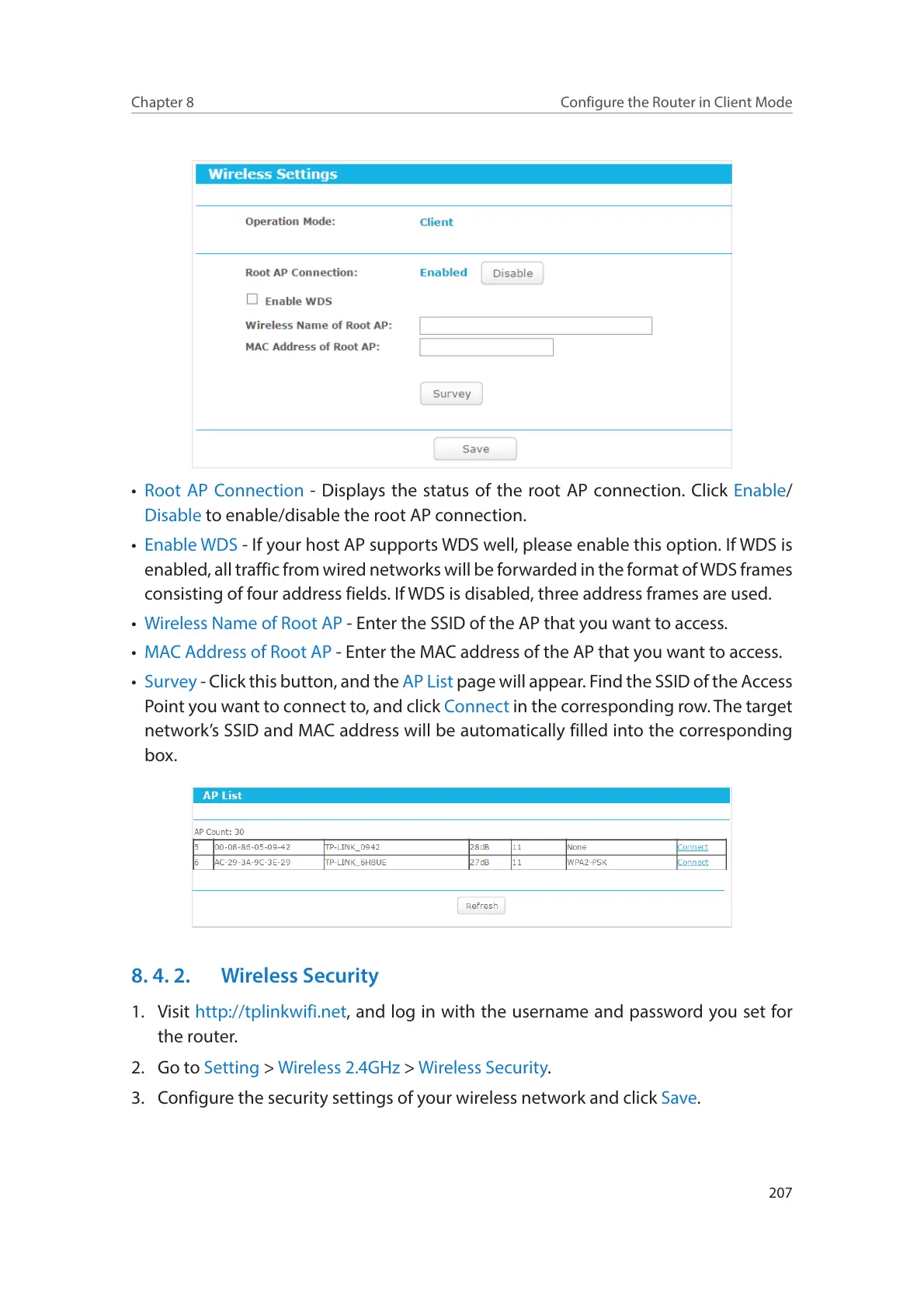 • Survey - Click this button, and the AP List page will appear. Find the SSID of the Access