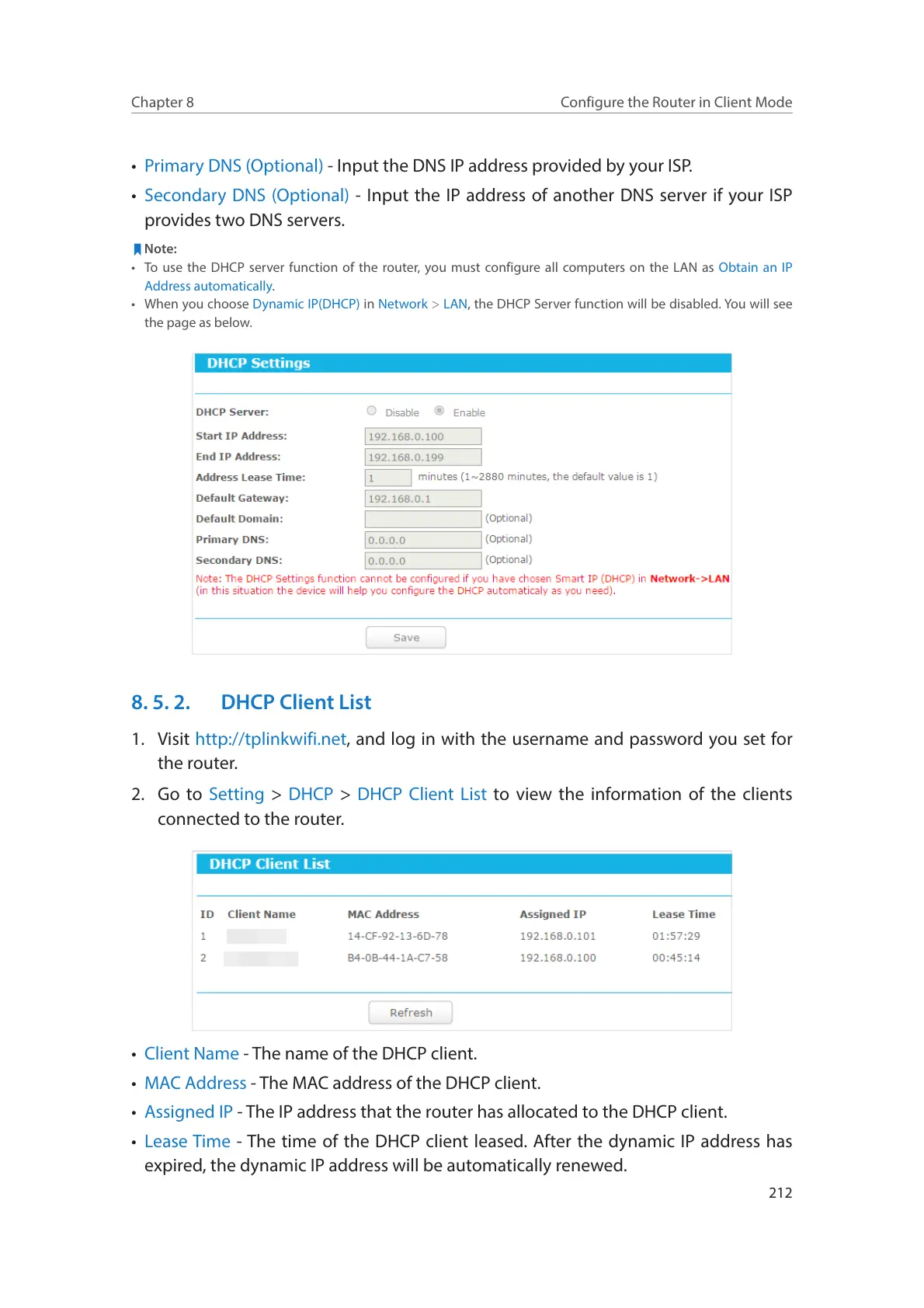 2. Go to Setting > DHCP > DHCP Client List to view the information of the clients