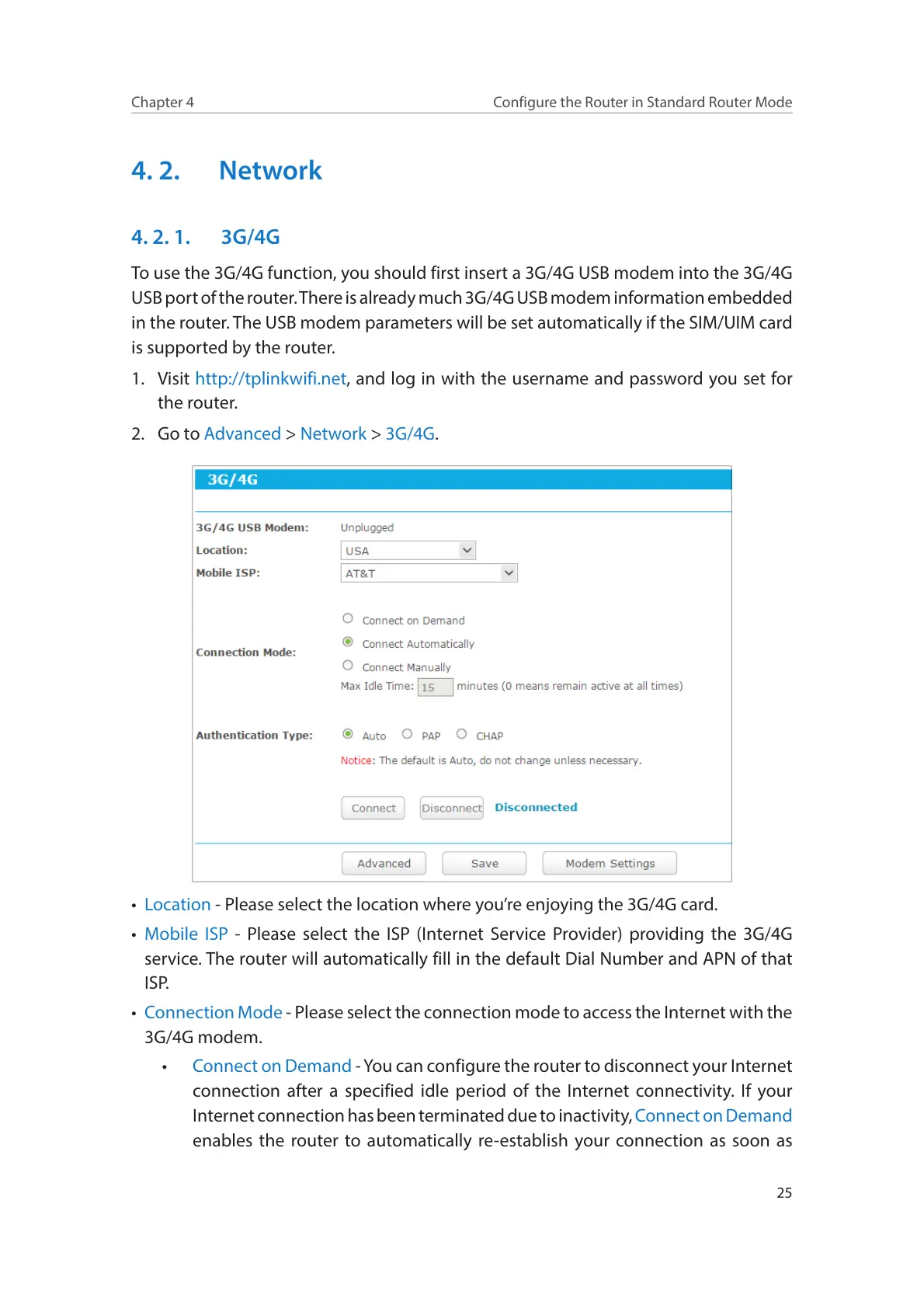 • Connection Mode - Please select the connection mode to access the Internet with the