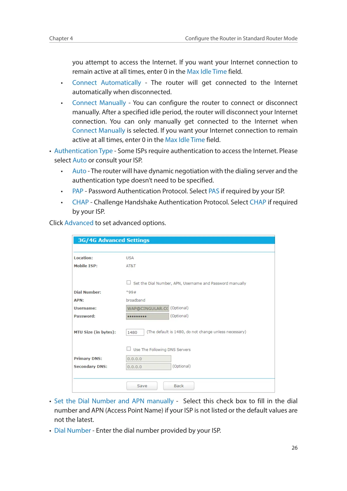 manually. After a specified idle period, the router will disconnect your Internet