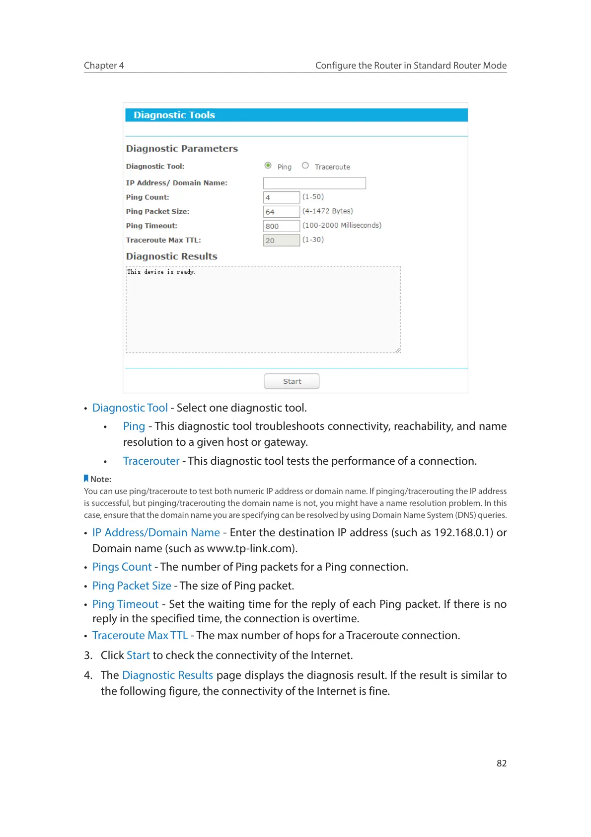 3. Click Start to check the connectivity of the Internet.