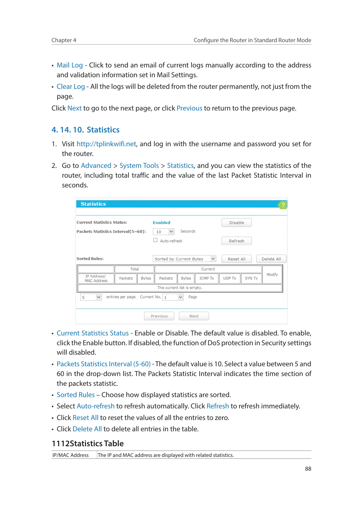 • Current Statistics Status - Enable or Disable. The default value is disabled. To enable,