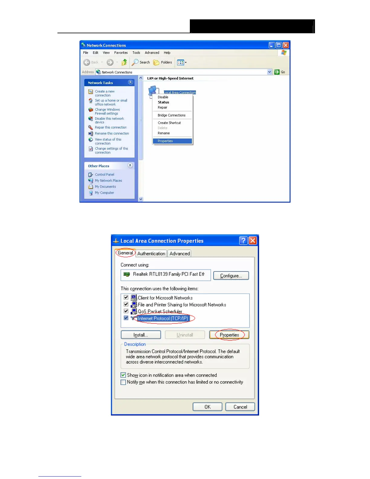 Step 3: Select General tab, highlight Internet Protocol (TCP/IP), and then click the Properties