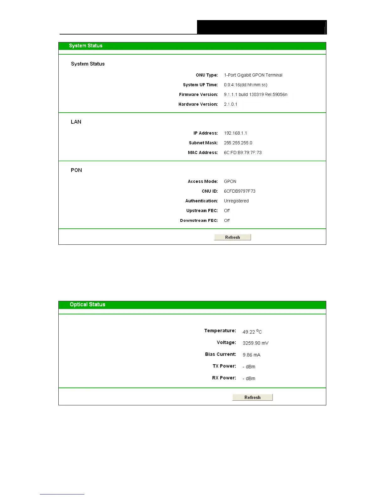 Choose “StatusÆOptical Module Status”, and you will see the ONT’s current optical module