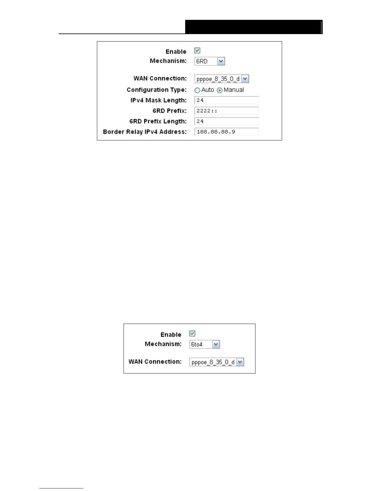 Border Relay IPv4 Address: The IPv4 address of the border relay router of 6RD tunnel.