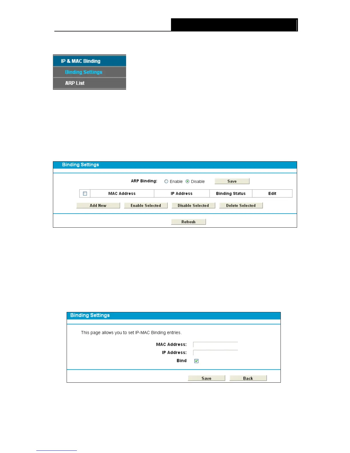 There are two submenus under the IP &MAC Binding menu: Binding Settings and ARP List.