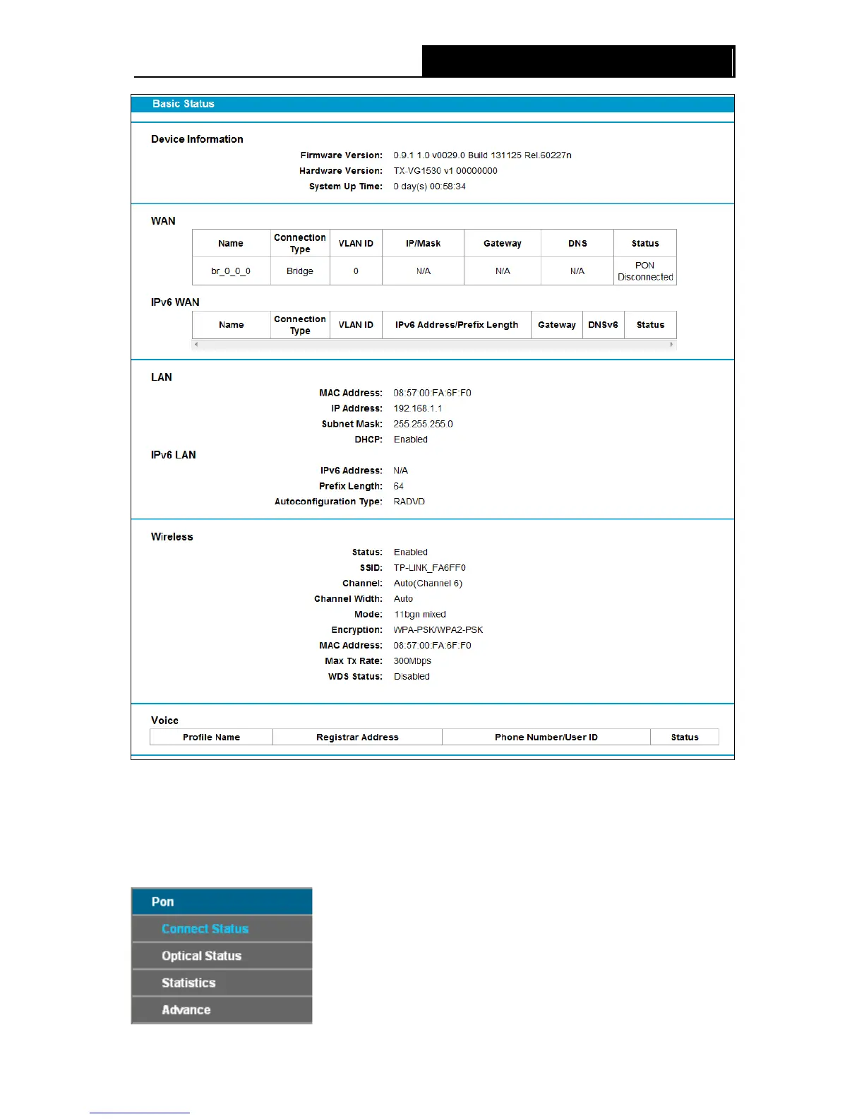 Choose “PON”, there are four submenus under the main menu: Connect Status, Optical Status,