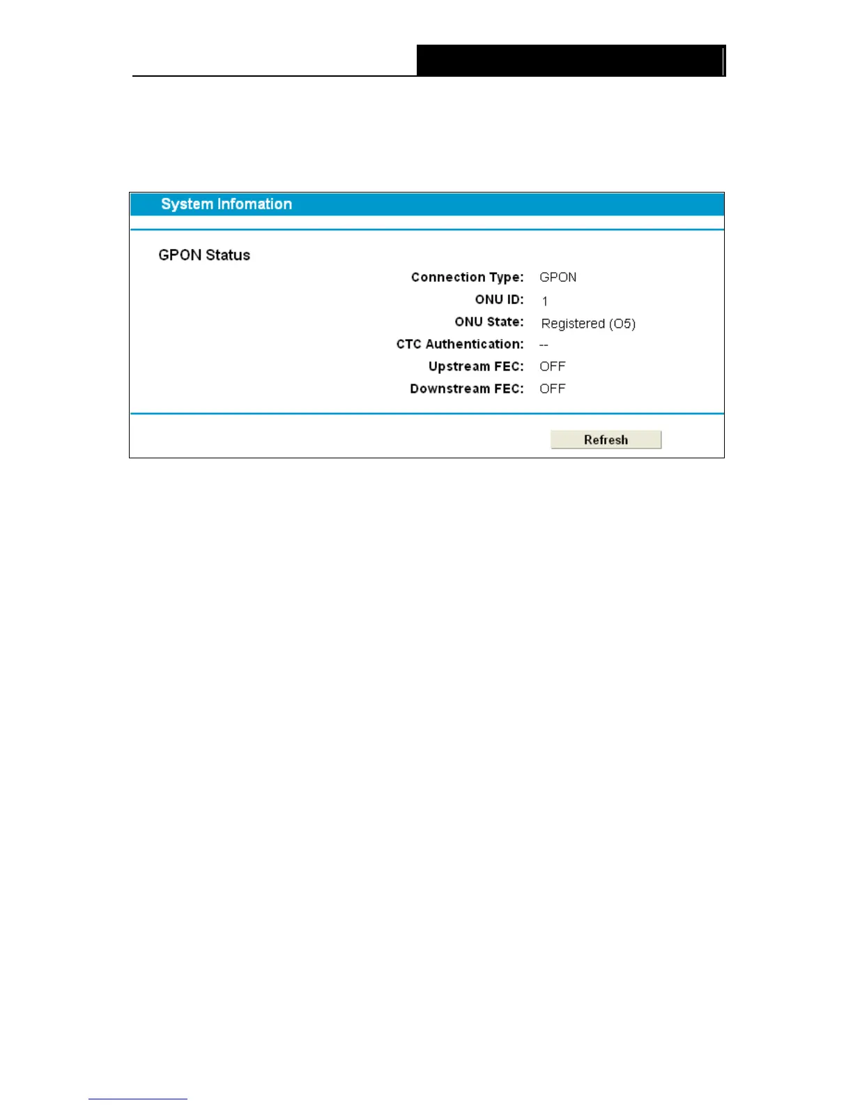 Choose “PON”“Connect Status”, the GPON Status screen will appear, click Refresh to update