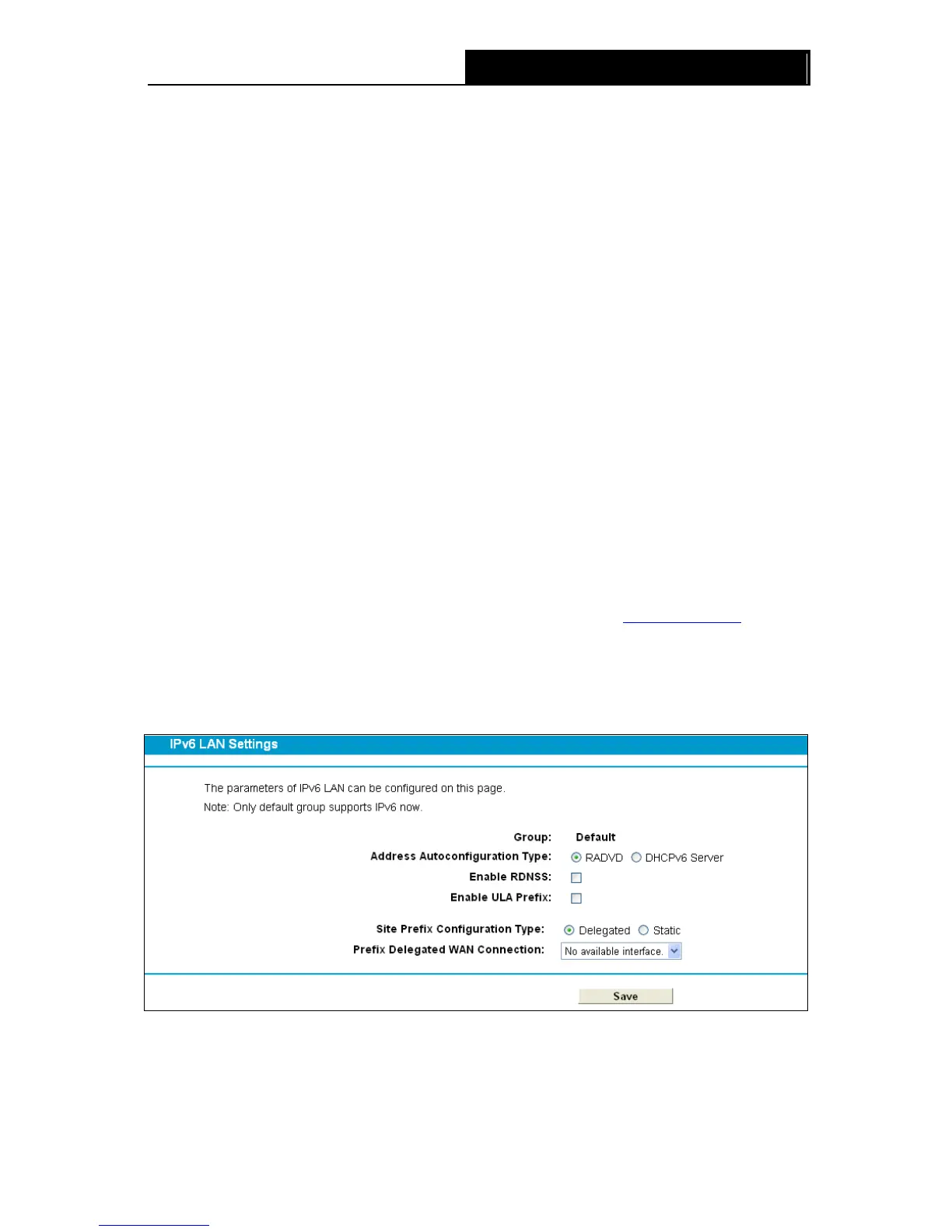 Choose menu “Network”“IPv6 LAN Settings”, you can configure LAN IPv6 interface for your