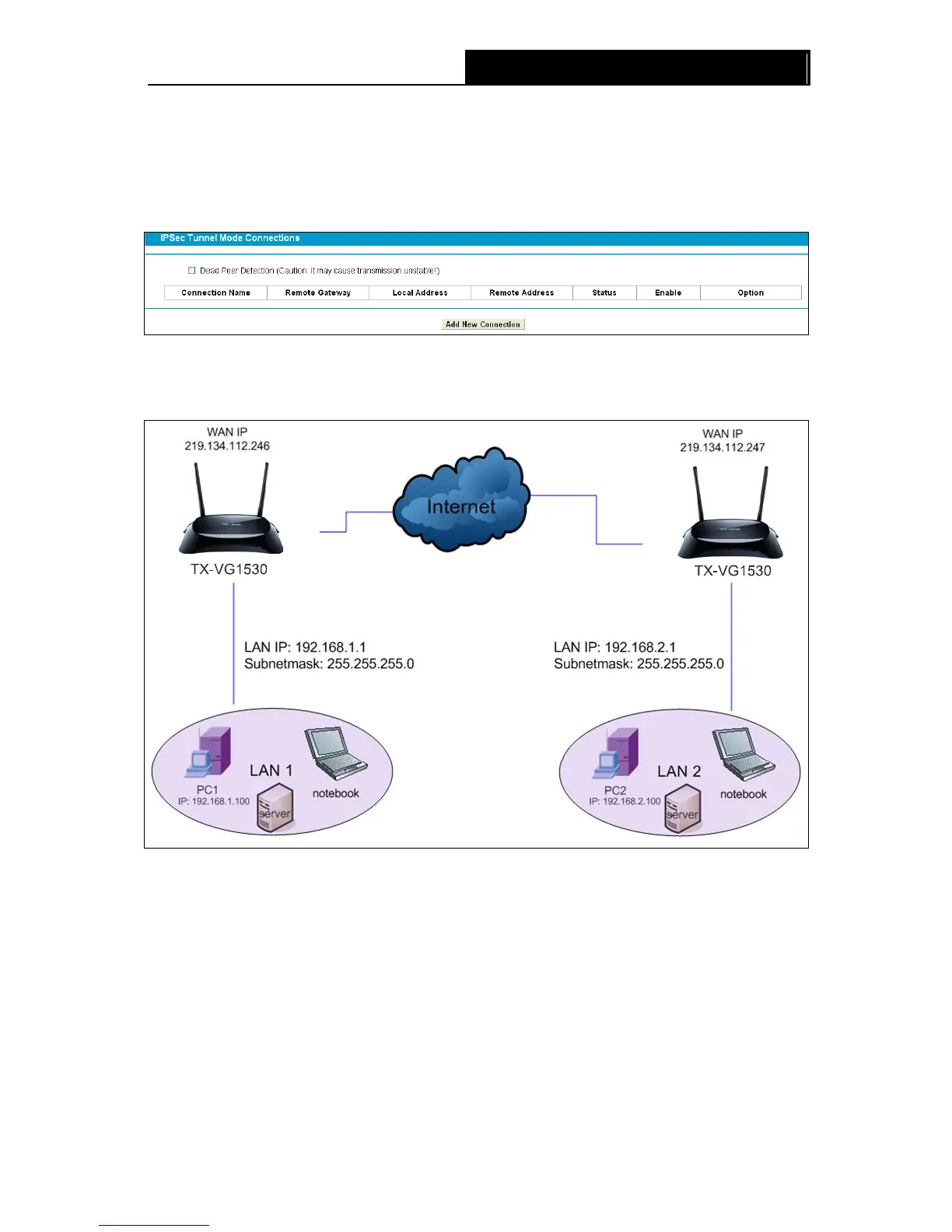 This section will guide you to configure a VPN tunnel between two TX-VG1530s. The topology is