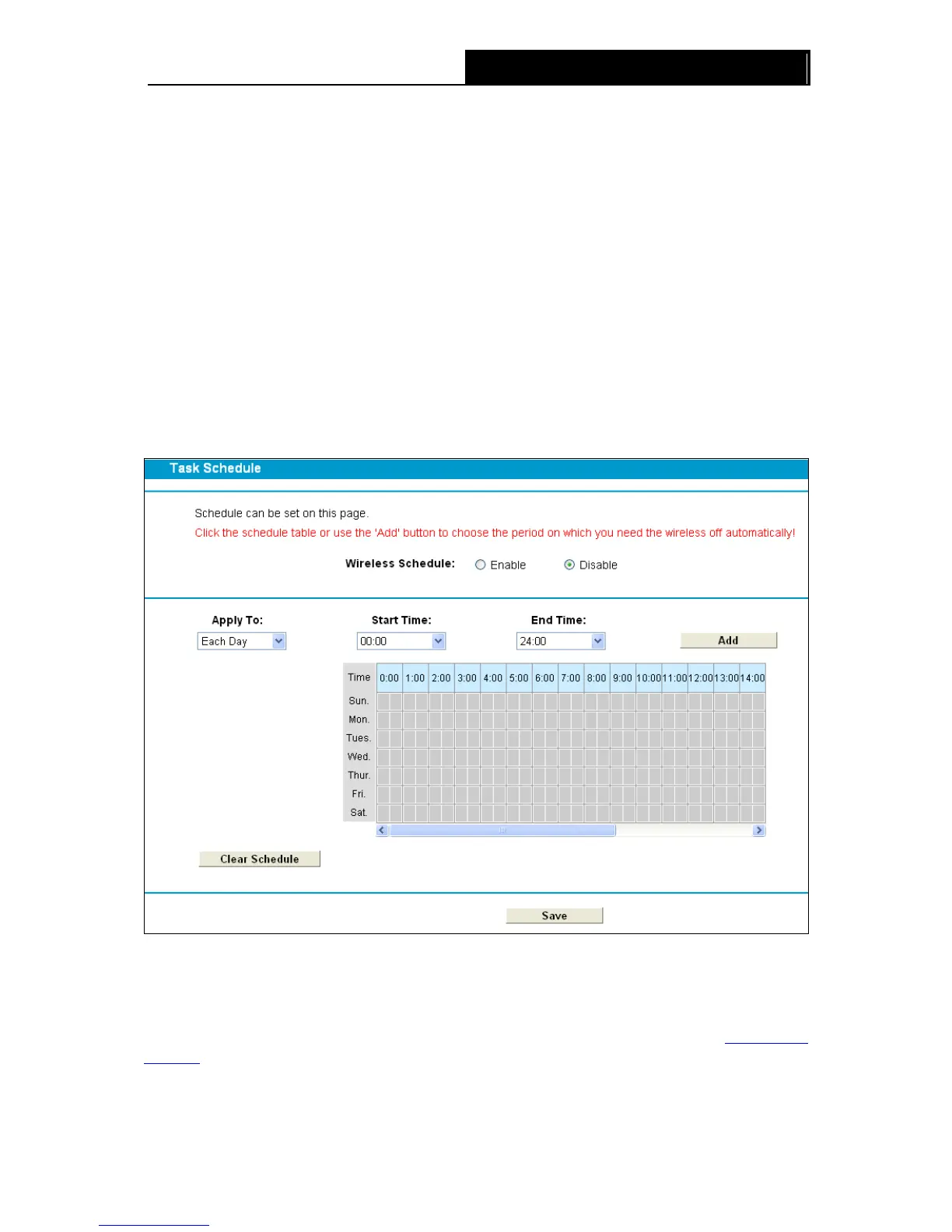 Choose menu “Wireless”“Wireless Schedule”, you can configure the Task Schedule as shown
