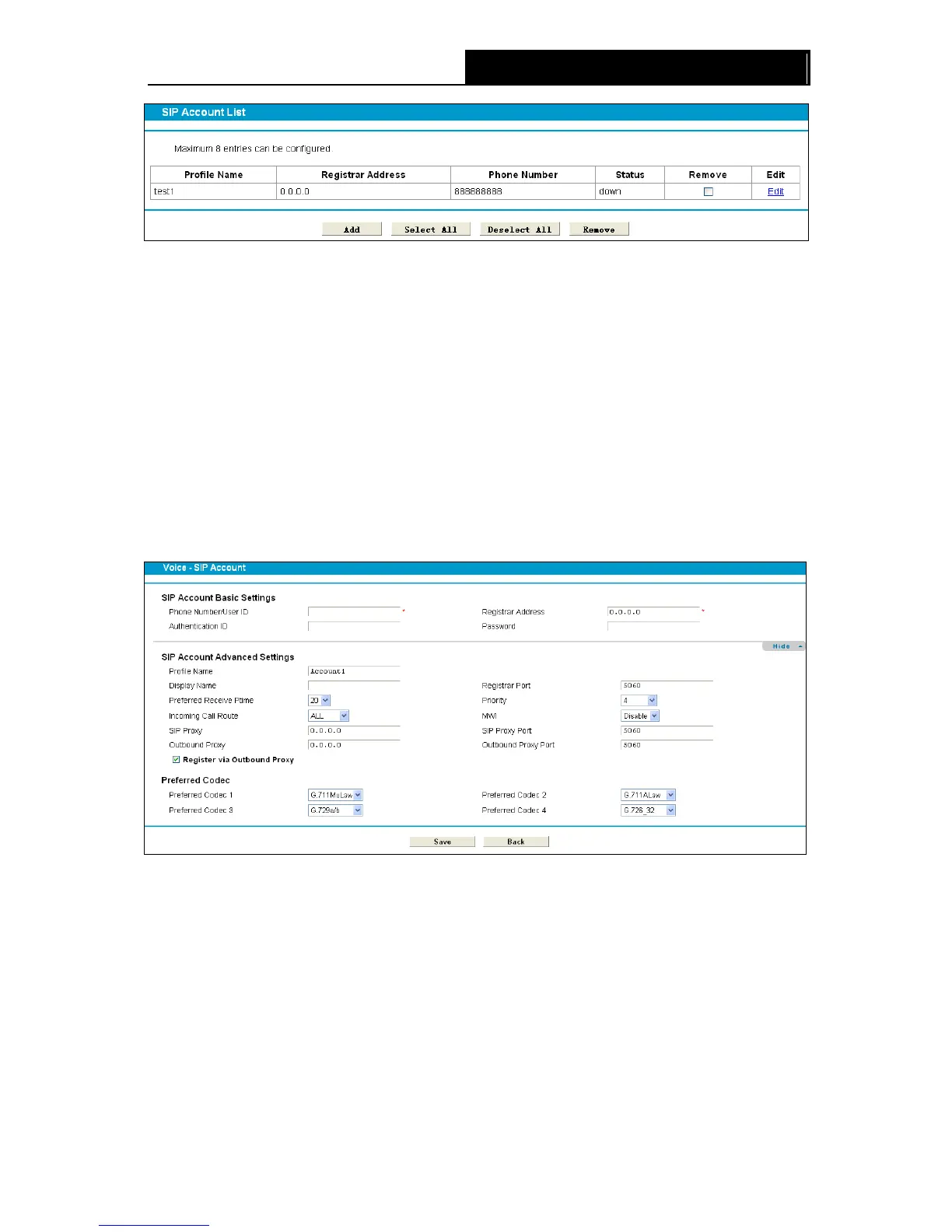 To set up an SIP account, click the Add button in Figure 4-46. Configure the following parameters