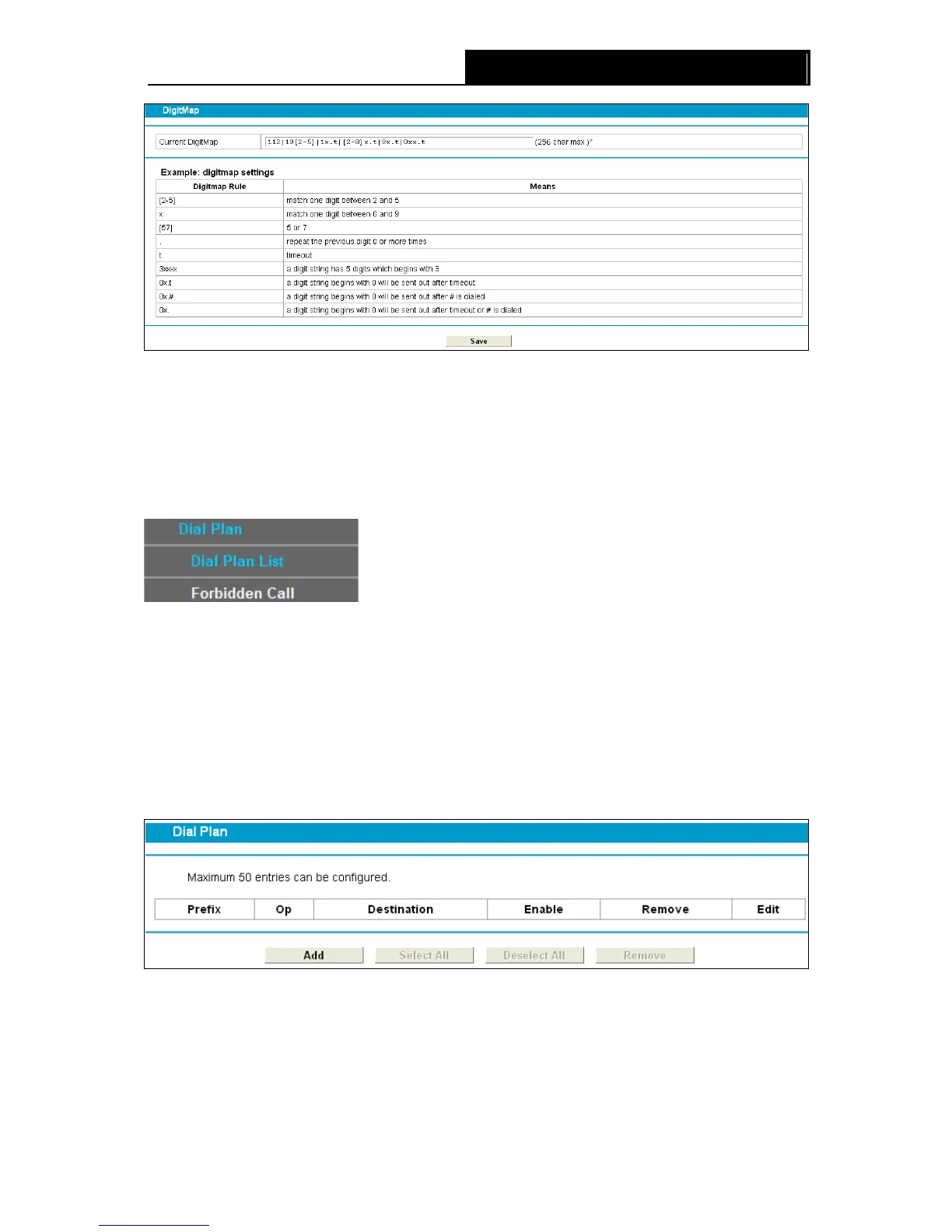 This section includes Dial Plan List and Forbidden Call. The function allows users to set rules for