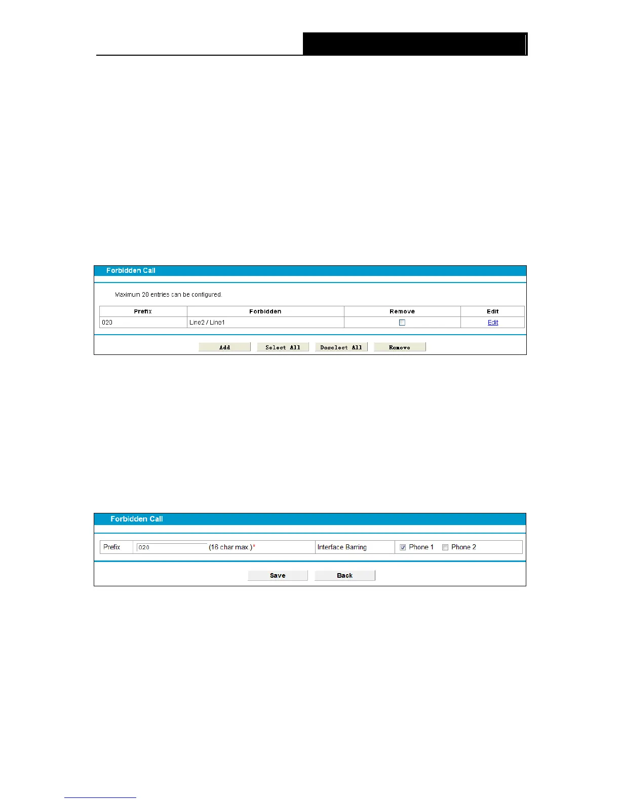 in Forbidden Call list are not allowed to be dialed out through the selected interface(s).