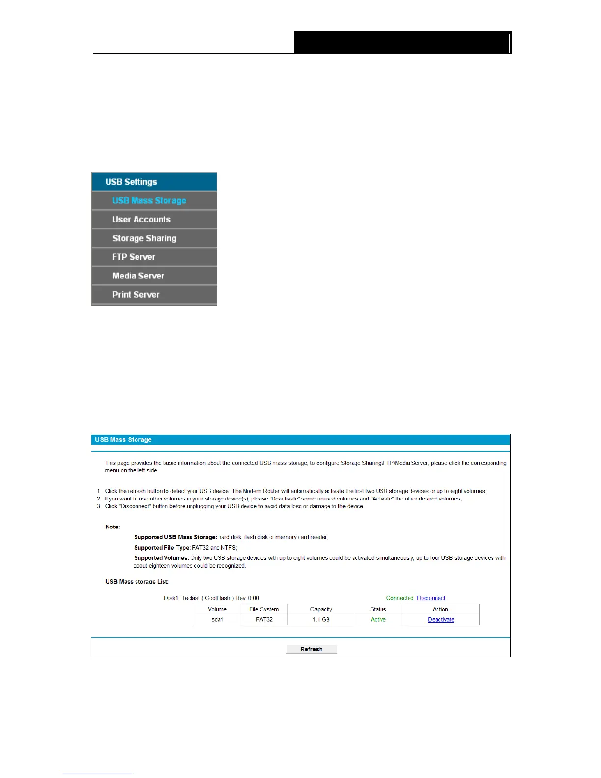There are six submenus under the USB Settings menu, USB Mass Storage, User Accounts,