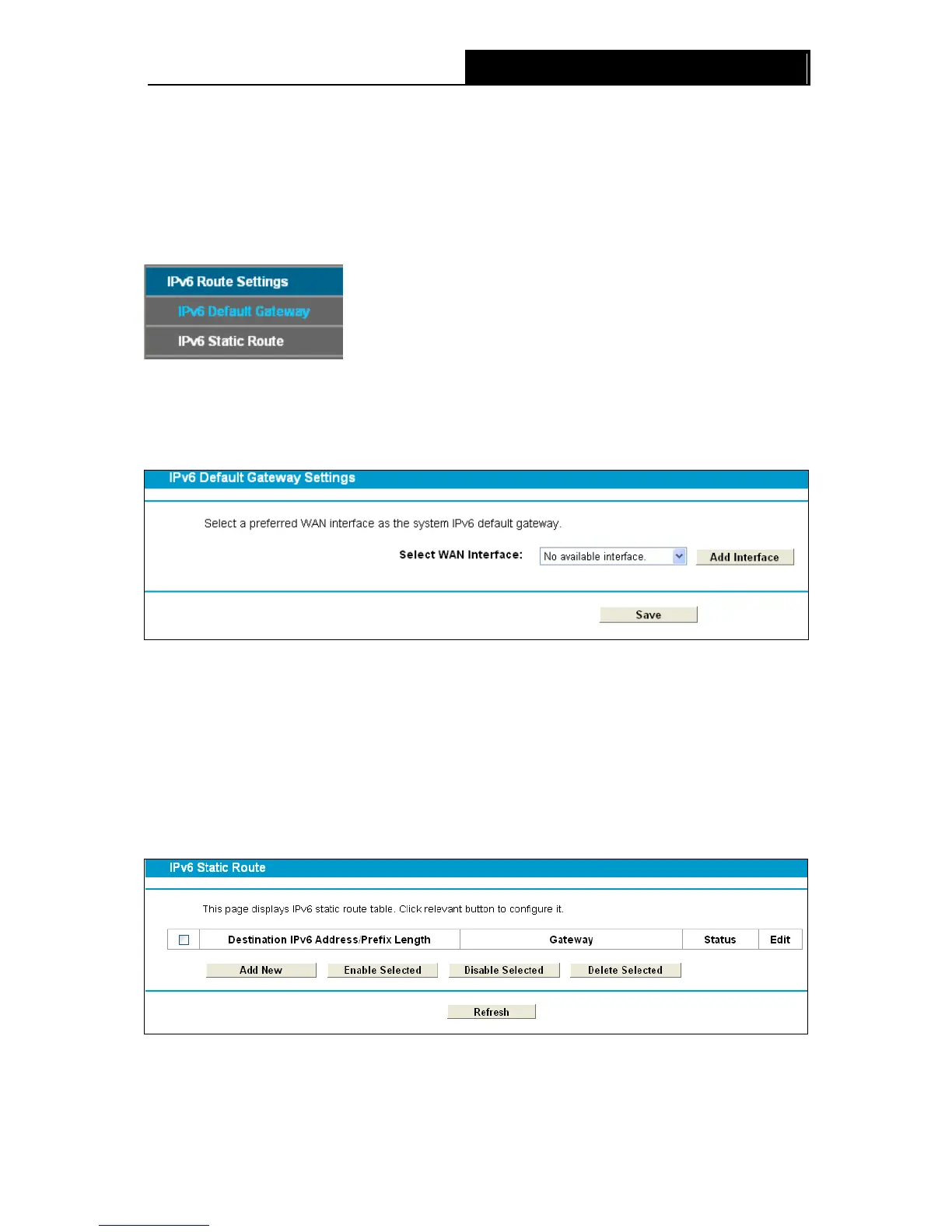 Choose “IPV6 Route Settings”, it includes three menus: IPv6 Default Gateway, IPv6 Static
