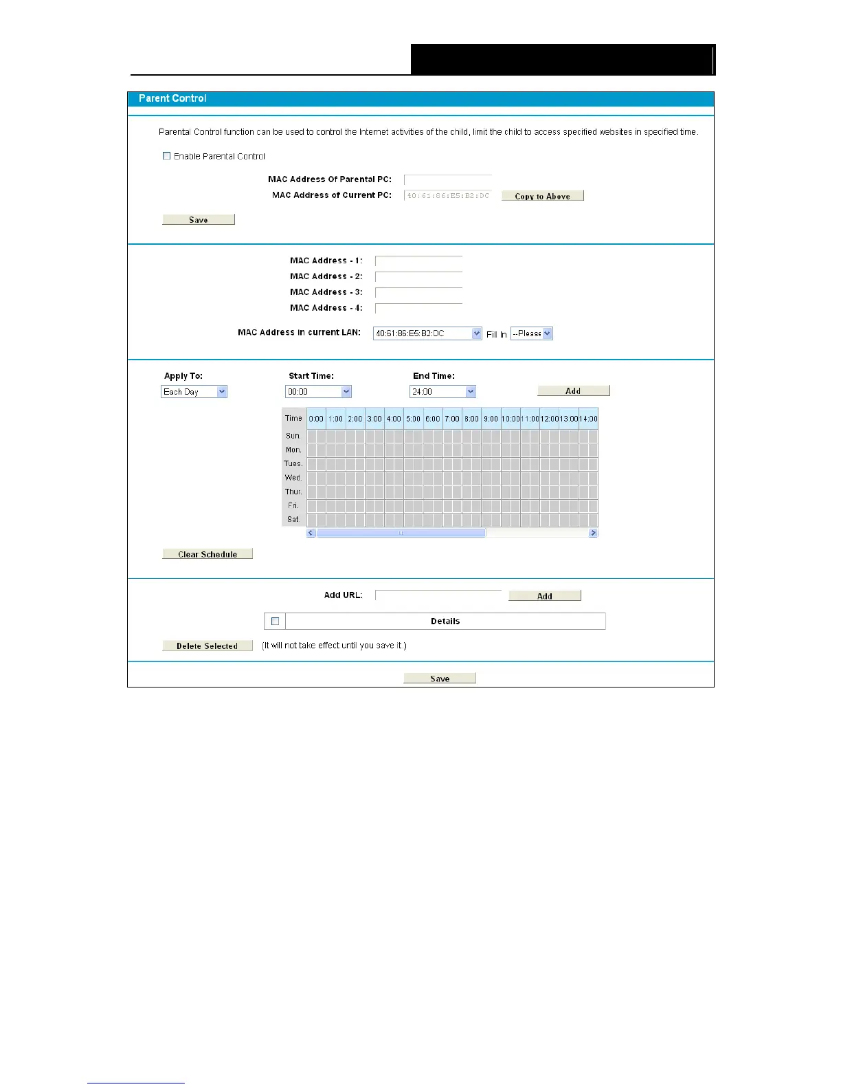 MAC Address of Parental PC: In this field, enter the MAC address of the controlling PC, or