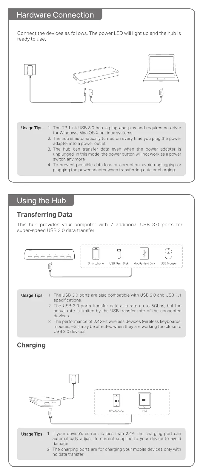 TP-Link UH720 - Hardware Connection and Setup; Hub Functionality and Usage; Super-Speed Data Transfer; High-Power Device Charging