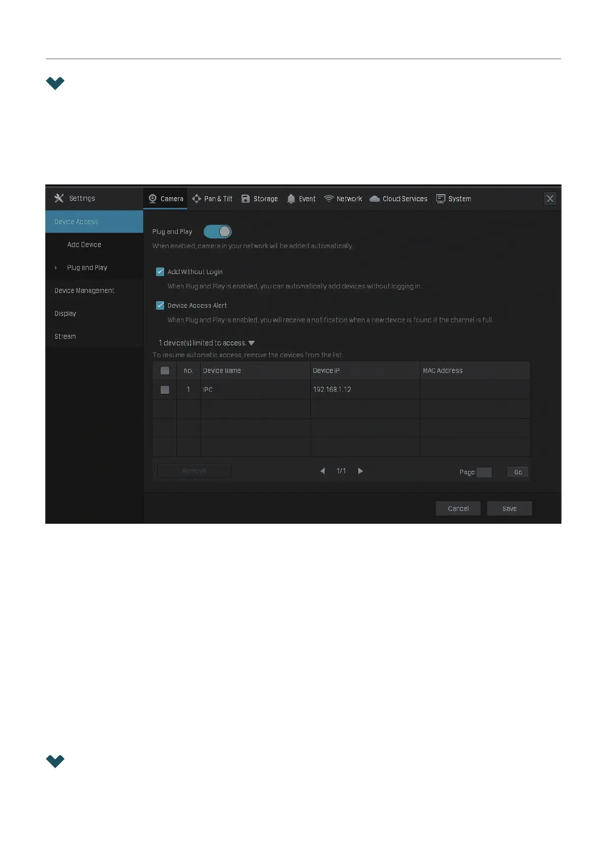 Plug and Play function enables NVR to automatically find and add cameras. You can enable or disable