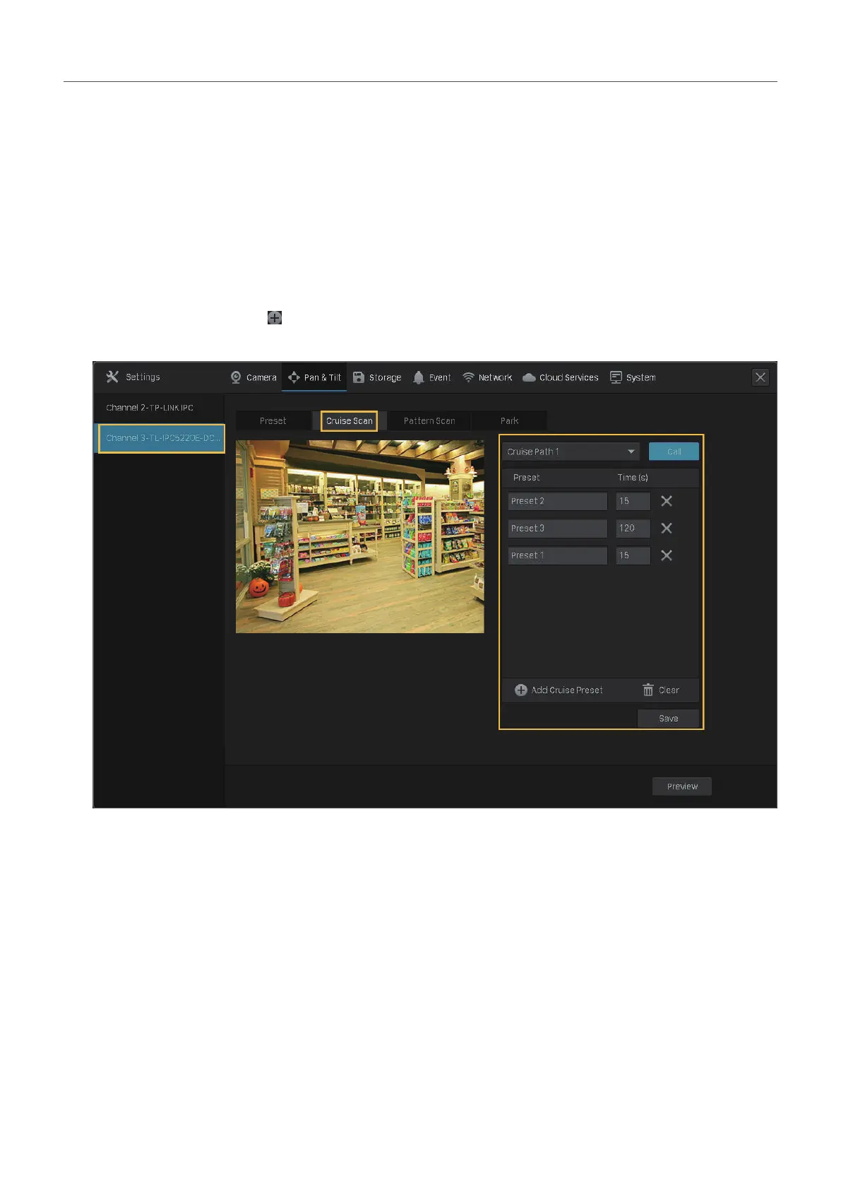 In Cruise Scan, you can configure paths for patrol. A path consists of several preset positions, and your