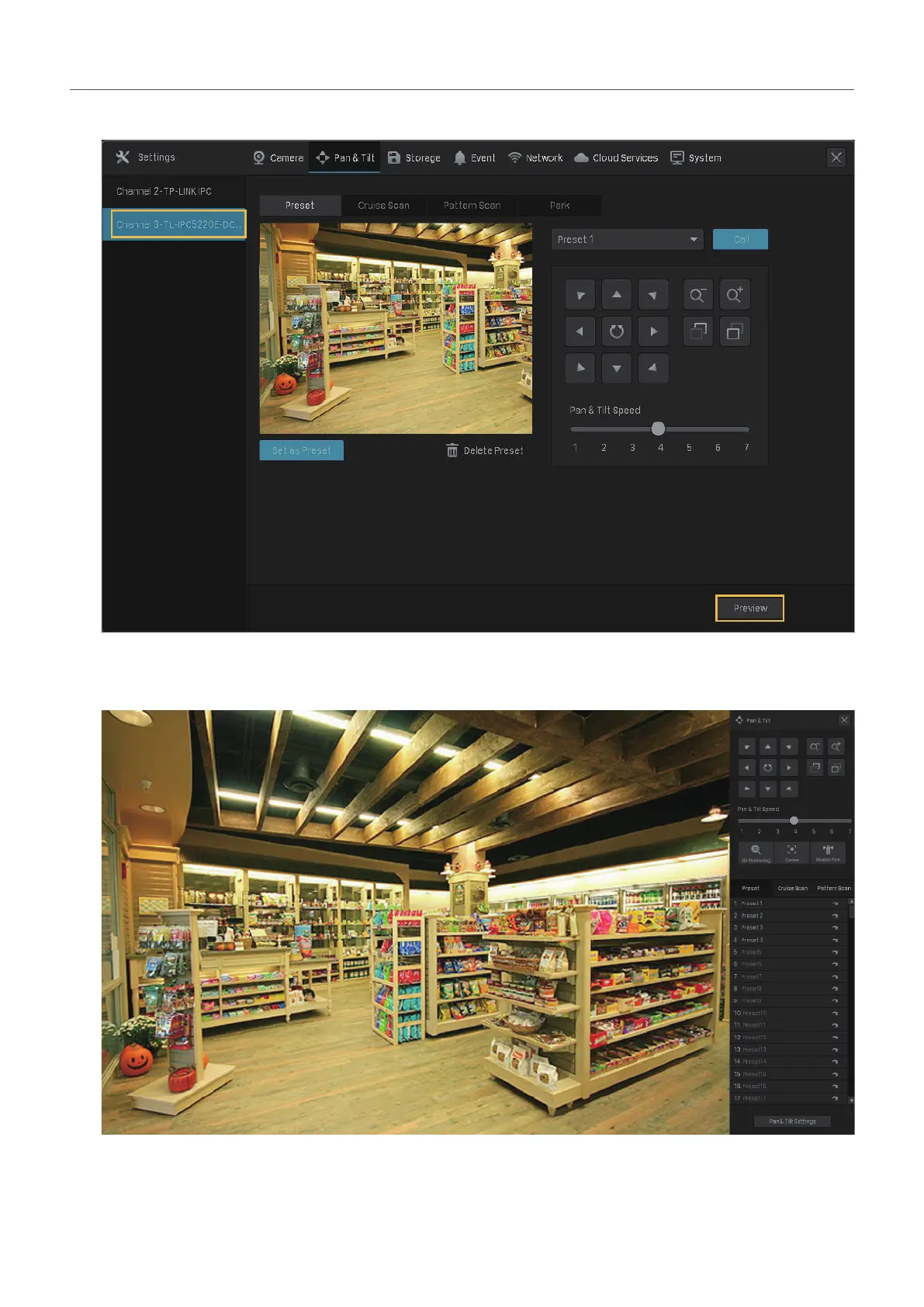 2. Go to Pan&Tilt. Select a channel listed on the left panel and click Preview.