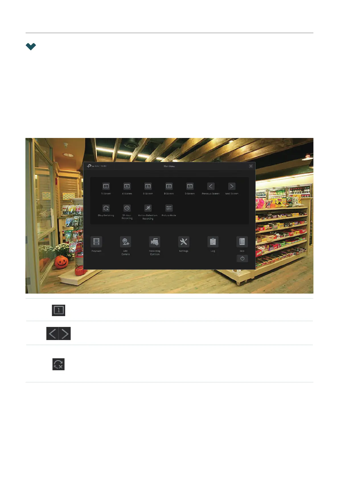 The NVR supports 5 layout modes (1/4/6/8/9-Screen), which display 1, 4, 6, 8, 9 screen(s) in one page