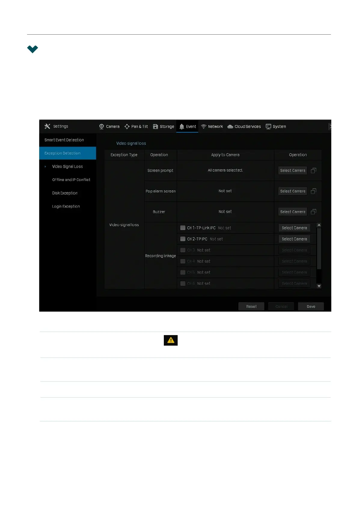 Alarm actions will be triggered when the NVR cannot get video signal from the camera and display