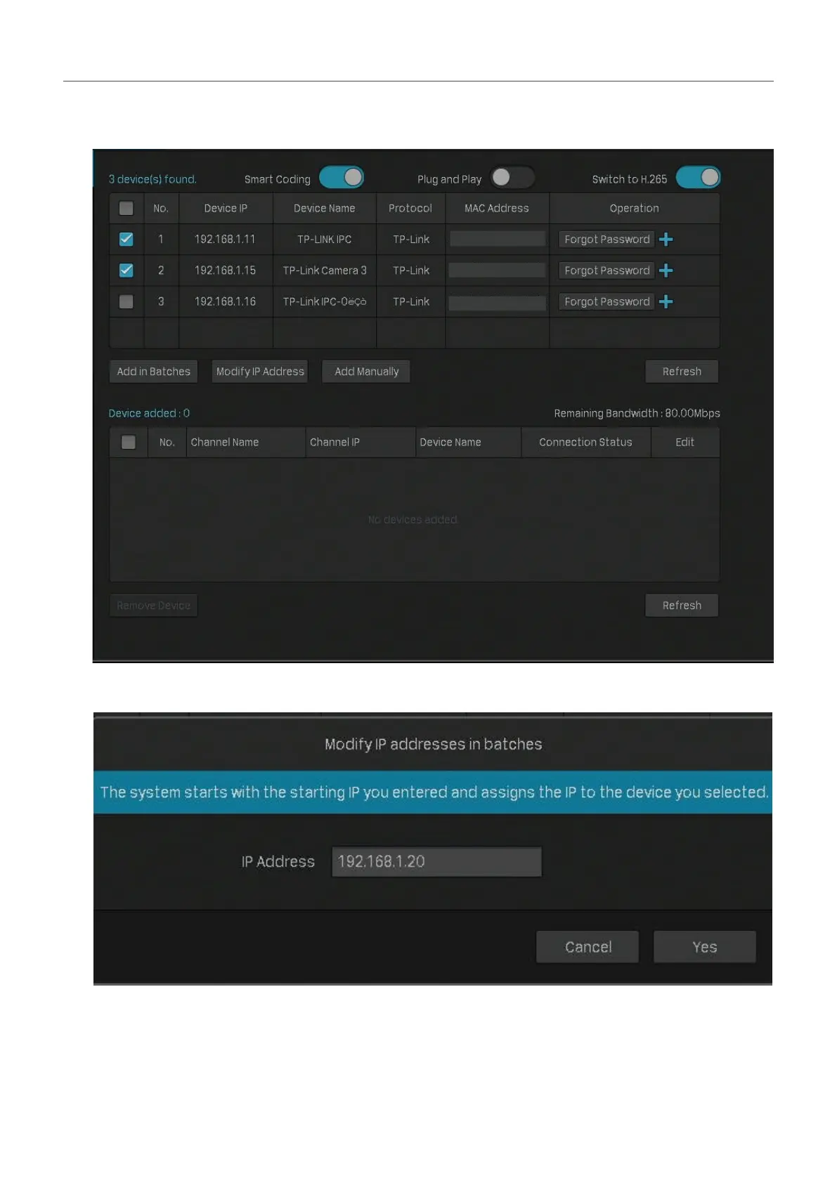 3. Set the starting IP address you assigned for the camera(s). Click Yes .