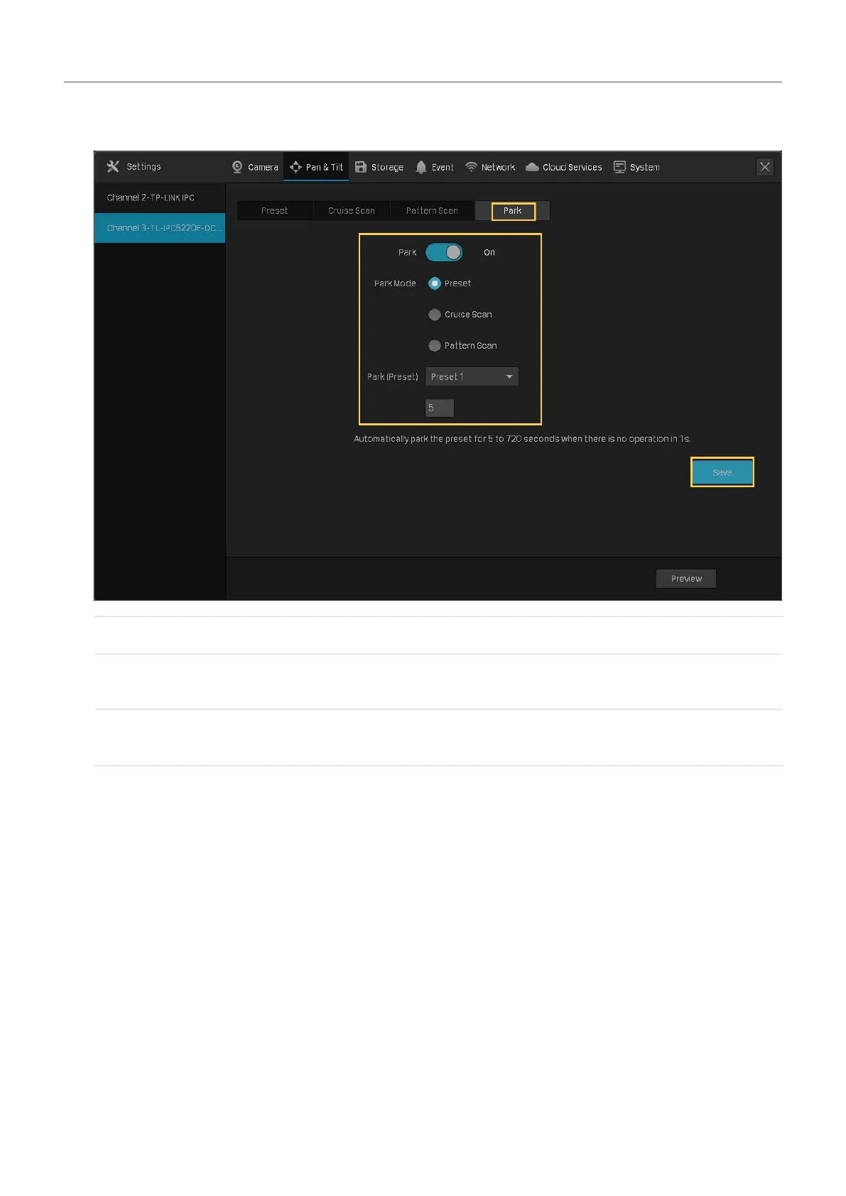 2. Select a channel listed on the left panel and click Park. Enable Park, select a mode and a preset,