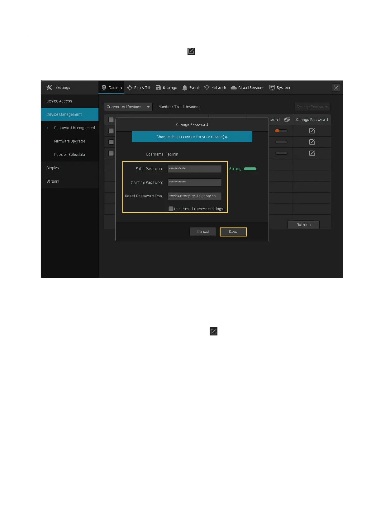 2. To change the settings of a single camera, click in the table. To change the password of multiple