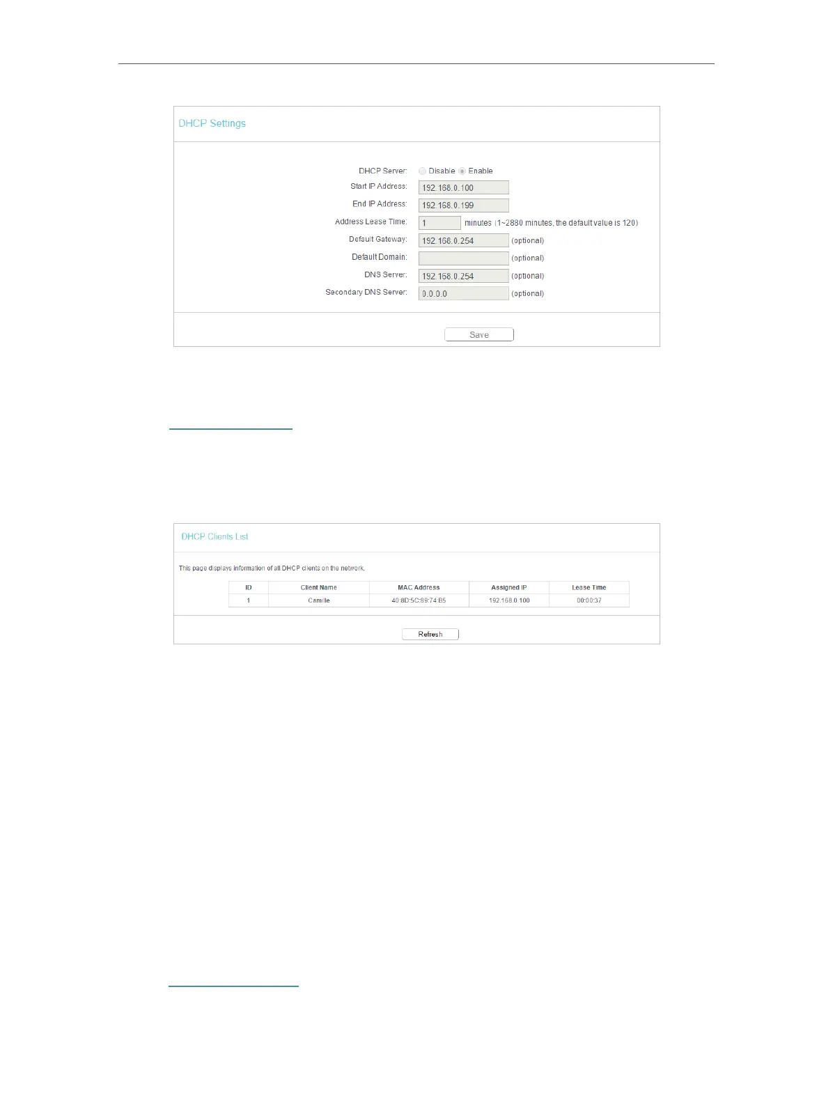 • Lease Time - The time of the DHCP client leased. After the dynamic IP address has