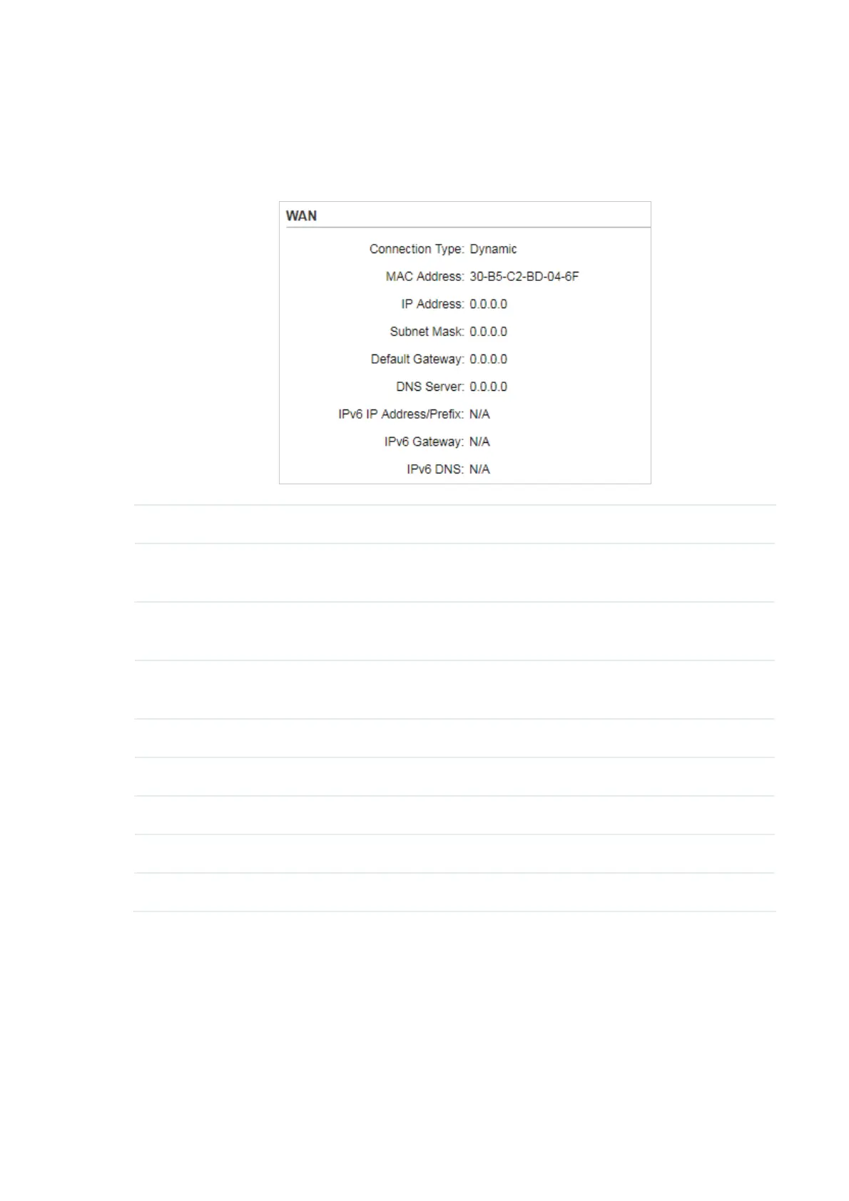 IPv6 IP Address/Prefix Displays the WAN port IPv6 address and prefix of the device.