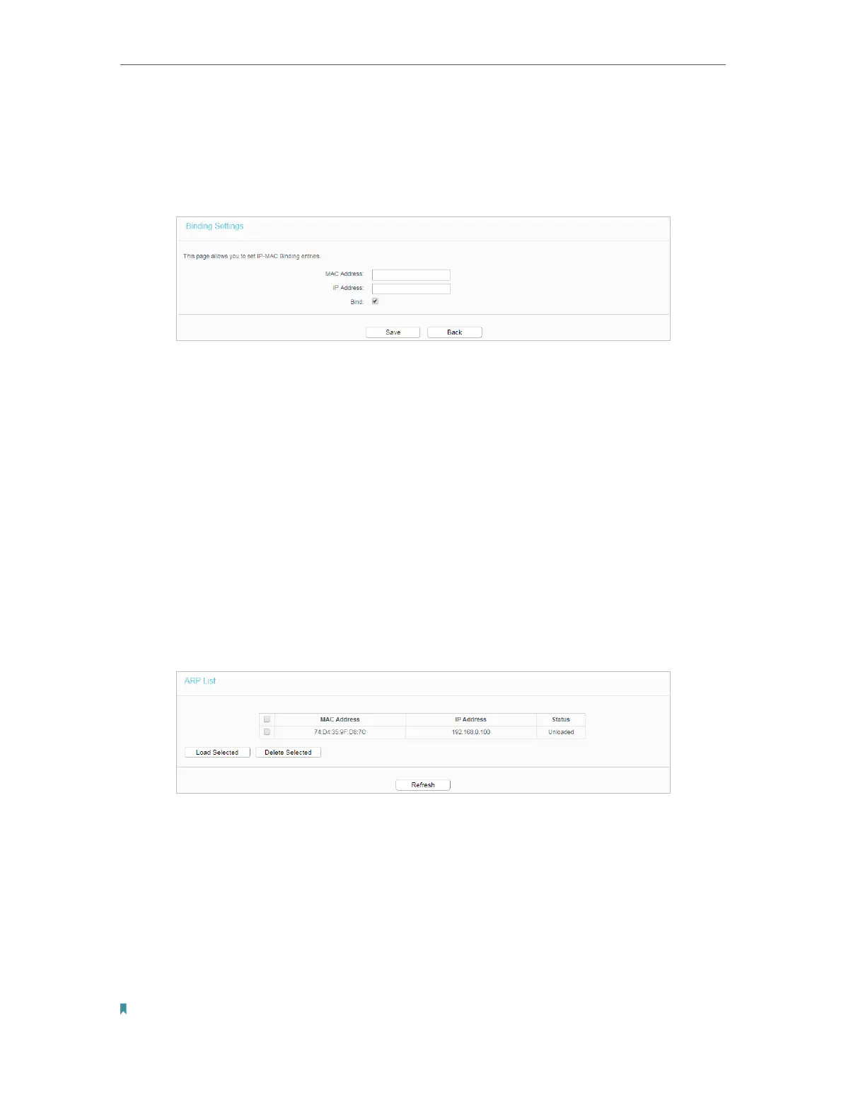 • Status - Indicates whether or not the MAC and IP addresses are bound.