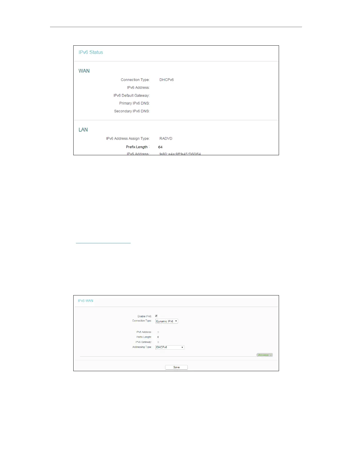 • WAN - This section shows the current IPv6 information of the router’s WAN port,