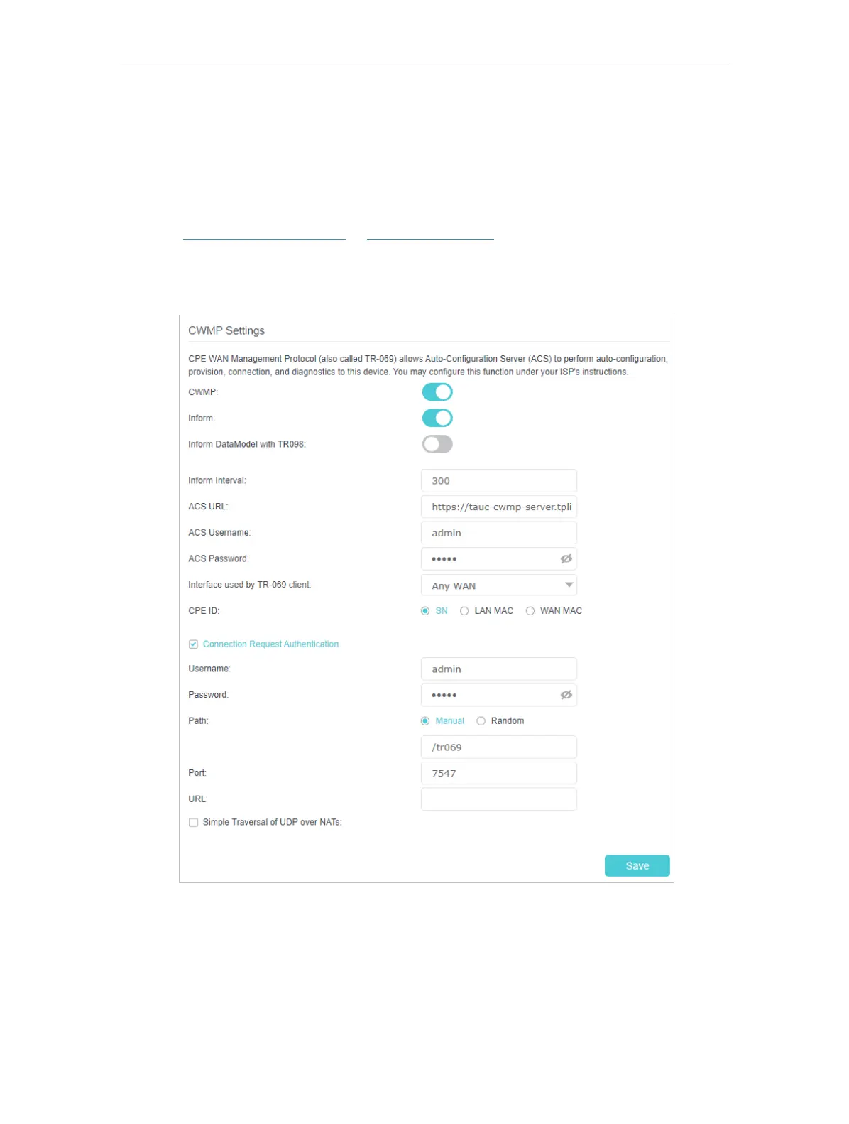 • CWMP: Enable or disable the CWMP (CPE WAN Management Protocol) function.