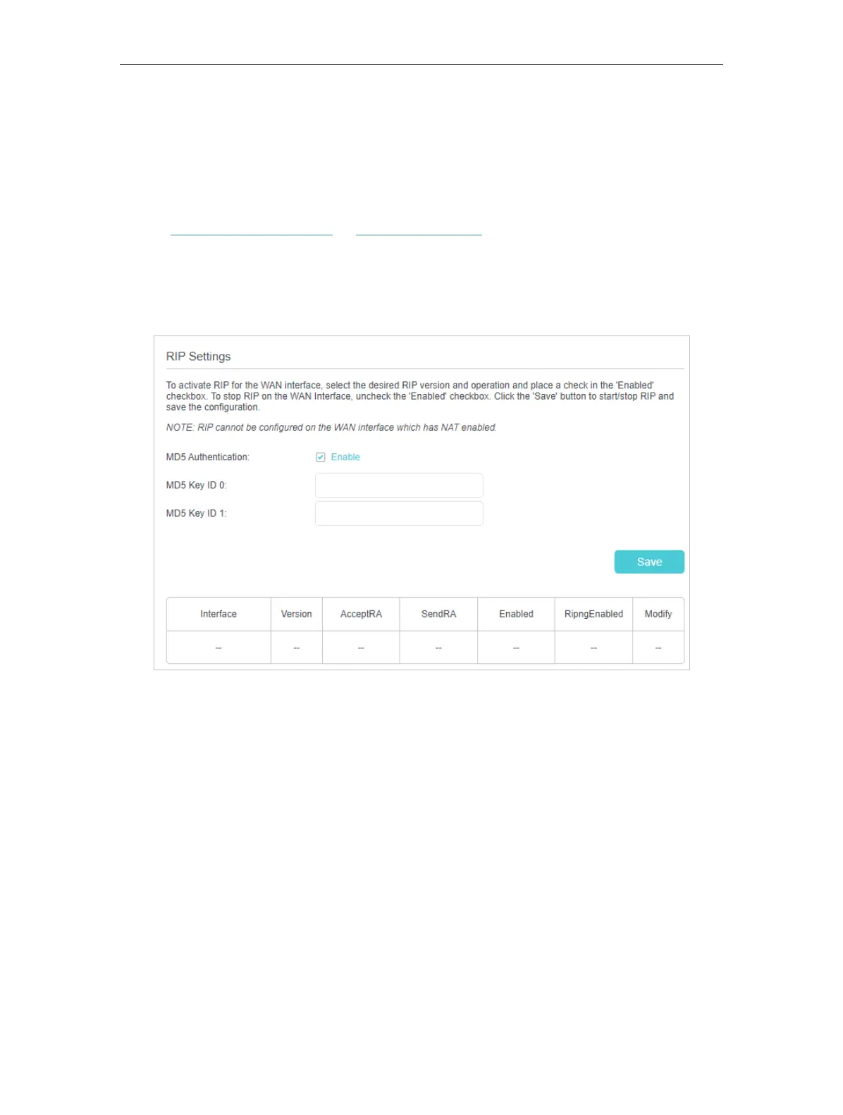 • MD5 Authentication - Enable MD5 Authentication to enhance the rip RA packets