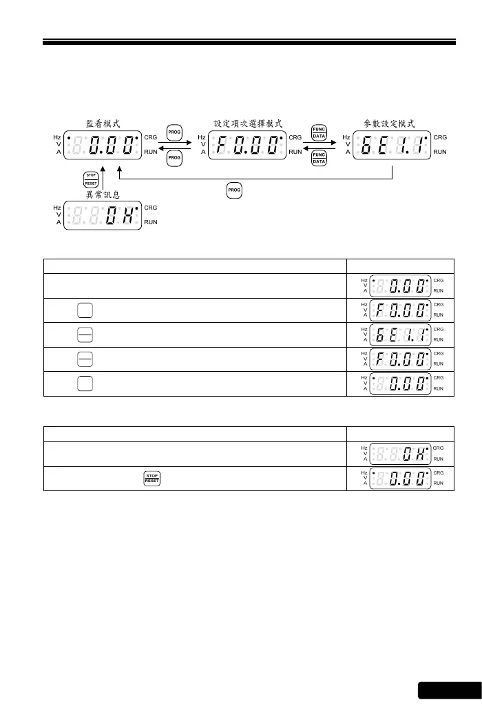 操作面板的操作狀態包含異常訊息與三種模式,切換方法如下圖所示:
