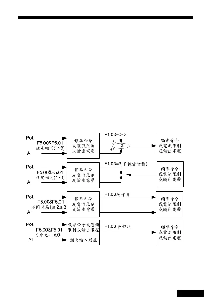 F1.01 = 0,頻率命令由類比信號輸入,則F5.00F5.01至少有一個必須設定為
