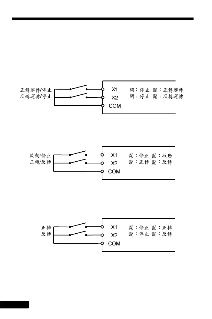(2) 啟動命令由操作面板控制;運轉方向由正轉指令端子及反轉指令端子控制。