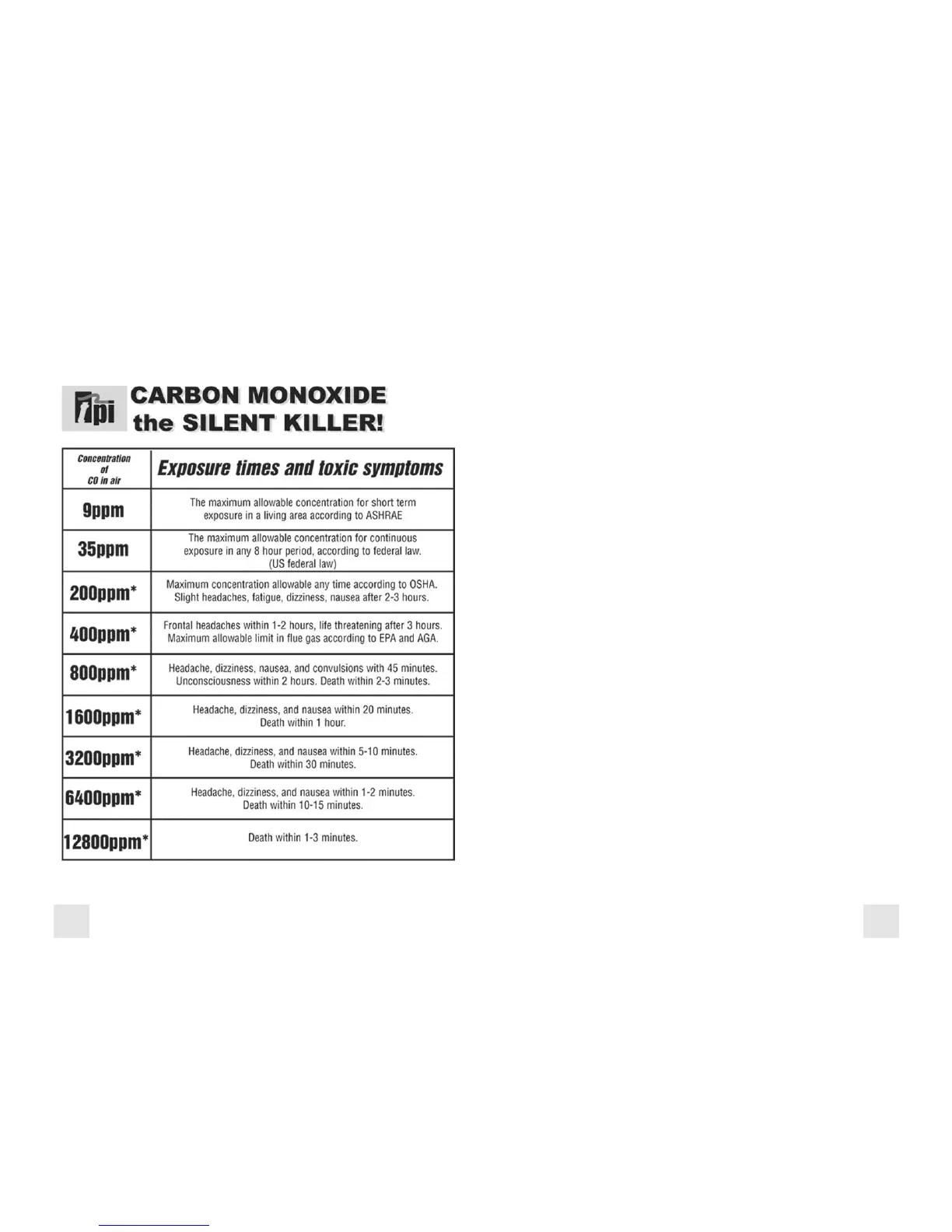 This chart contains maximum exposure levels and times for carbon monoxide.