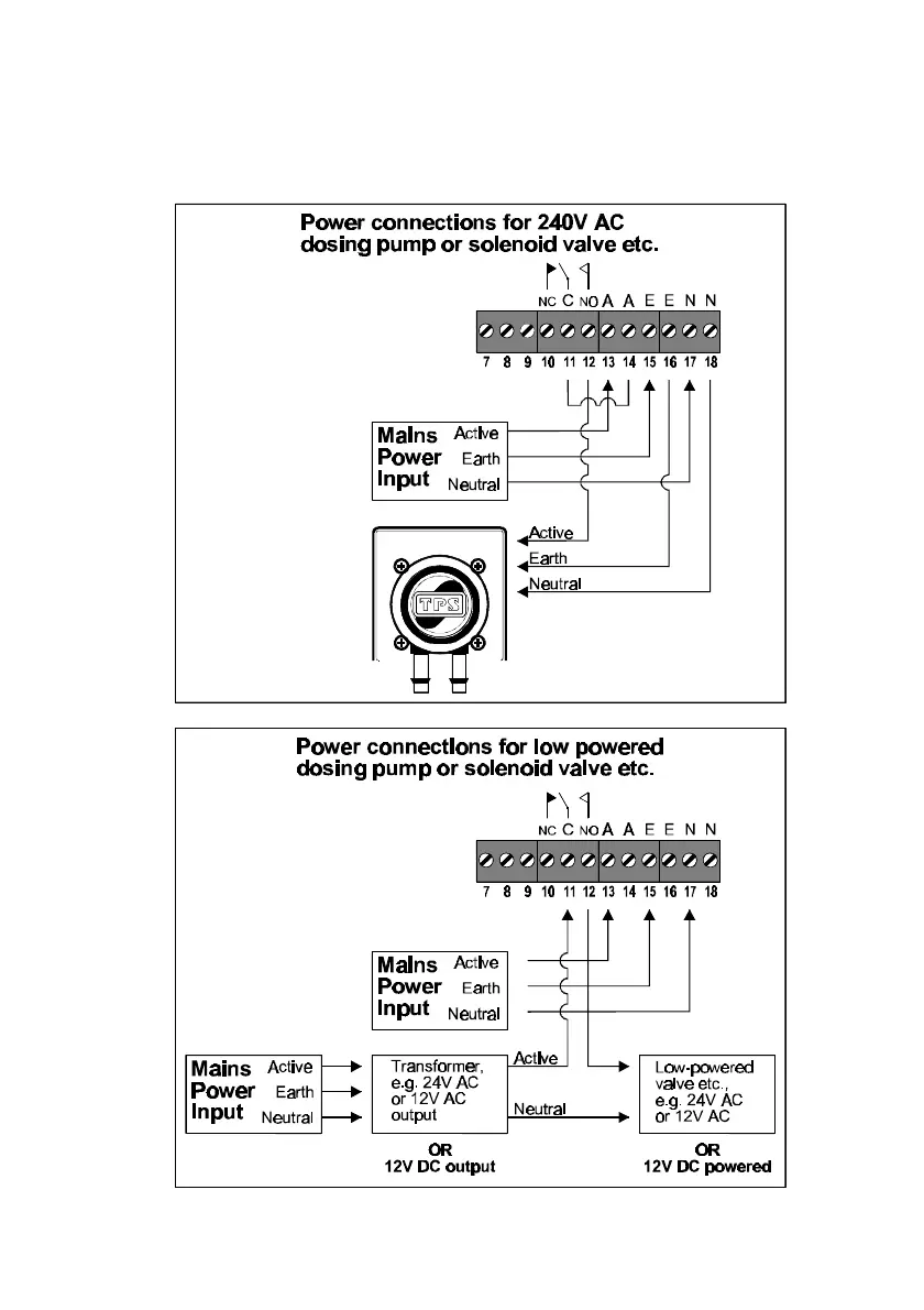 TPS miniCHEM-pH - Relay Output Wiring Examples for mains powered units