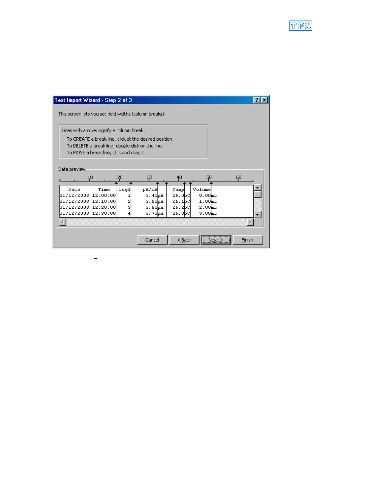 6. Simply press “Finish” at step 3 of the Text Import Wizard. TPS recommends that the data