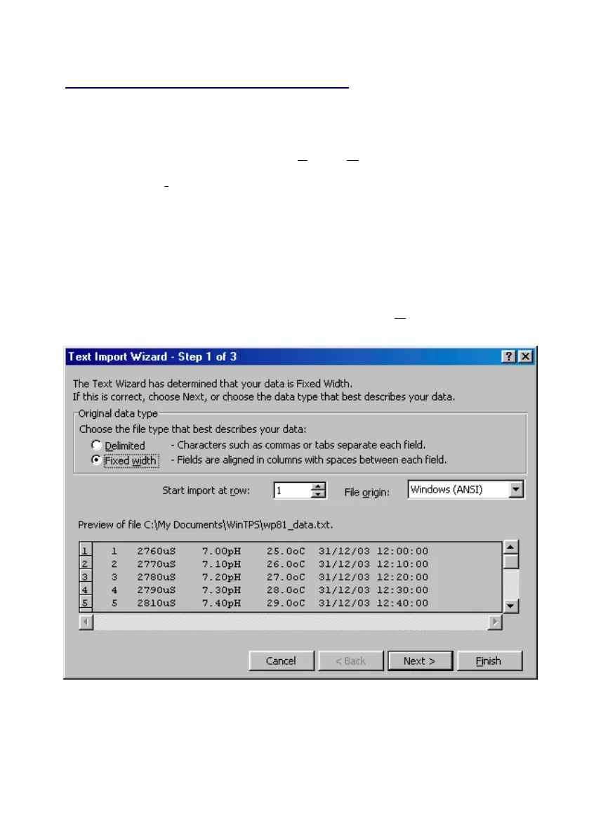 4. In step 1 of the Text Import Wizard select “Fixed width”, as per the