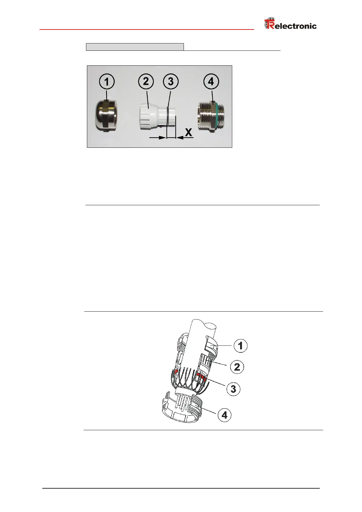 2. Slide the nut (1) and clamping ring (2) over the cable.