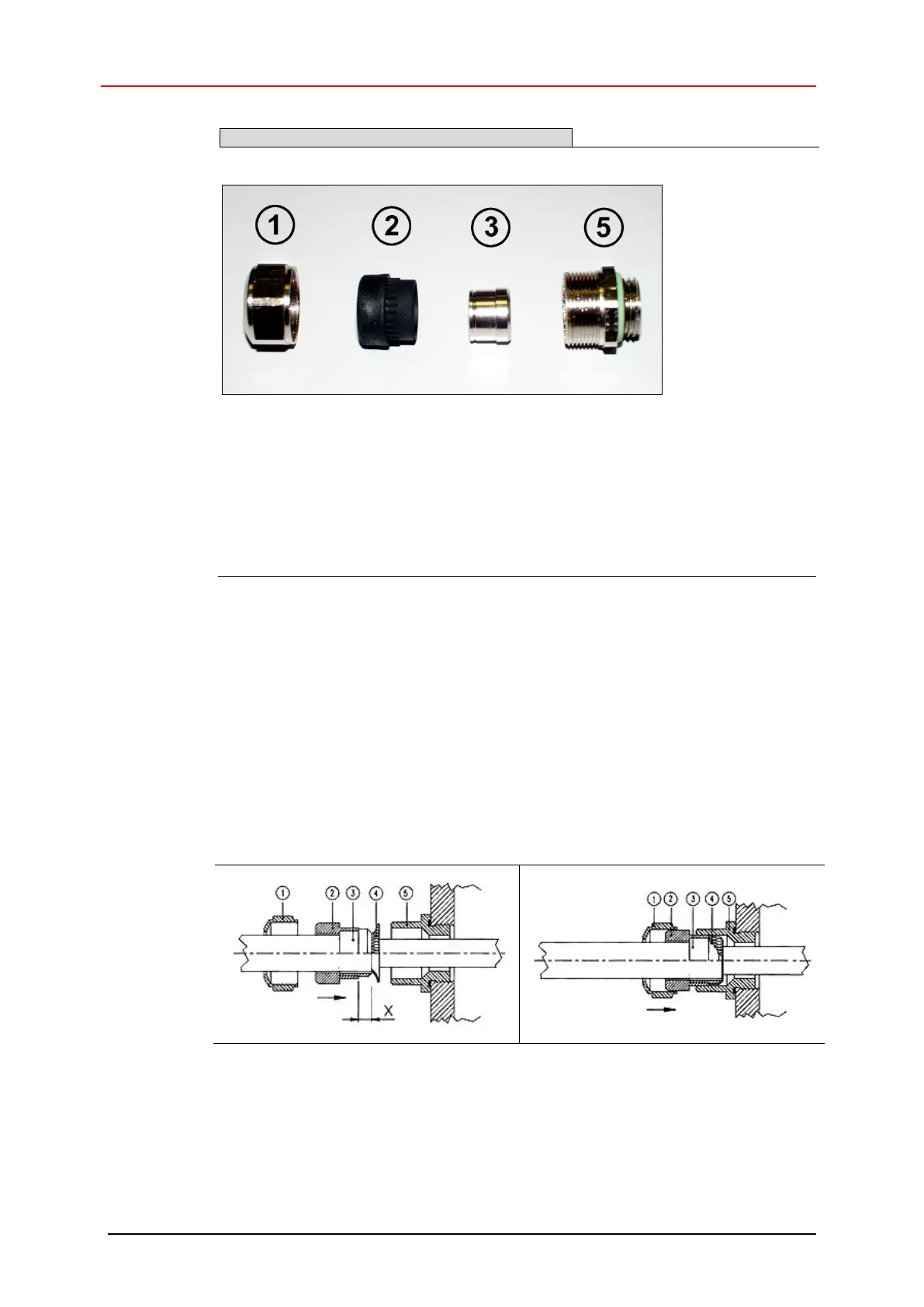 2. Überwurfmutter (1) und Dichteinsatz / Kontakthülse (2) + (3) auf das Kabel